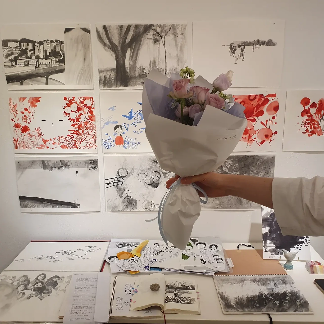 가장 먼저 짧게나마 써 두고 싶었던 것은 사랑하는 필제의 새로운 그림에 관한 것이다. 연구원에서의 2년 5개월을 되돌아보는 시점의 어느 저녁, 필제의 그림이 나를 울렸다. 지금까지 필제의 전시 중, 그 어느 때보다도 창작자 필제가 드러날 수밖에 없는 전시 콘셉트였다. 분명 어린 시절의 필제를 알지 못했을 텐데 어디선가 필제를 본 기분이 들었고, 어쩌면 필제의 어린 시절에서 나의 어린 시절을 본 것도 같아 그간 많이 돌보지 못한 우리 안의 ‘창작자’ 어린이와 눈을 맞추기 위해 황급히 쪼그려 앉게 되었다. 이 어린이는 떼쓰지 않는다. 울 때도 엉엉 글자 그대로 시원하게 운다. 무채색의 세계가 붉고 푸르게 물들여 가는 과정에 겁을 먹지도 않는다. 무엇보다도 나를 뚫어져라 쳐다본다.