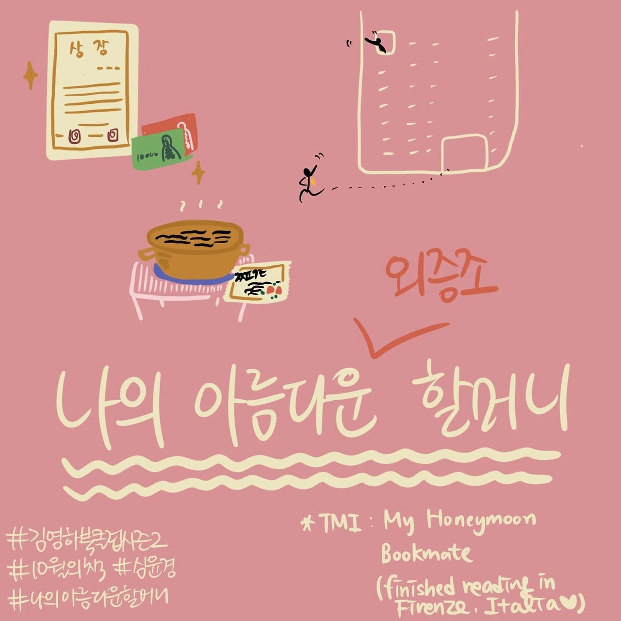심윤경 작가가 어린이였을 때, 조금 더 머리가 커졌을 때, 꿀짱아의 엄마가 되었을 때, 순간순간마다 할머니를 떠올리며 삶의 지혜를 배웠듯, 나 또한 할머니의 요리, 말, 행동을 어느 방송국의 자료화면처럼 생동감 있게 재생하곤 한다. 물론 자료 화면에 먼지가 조금 껴 있을 수도 있고 오류가 있을 수도 있다. 기억은 꺼내 볼 수록 왜곡 또는 미화된다고들 하니깐. 하지만 아무리 생각해도 떠올릴 수 있는 할머니가 있다는 건 행복하고 감사한 일이기에 어설픈 독후감을 남기는 와중에도 가슴 한편이 뭉근해진다.