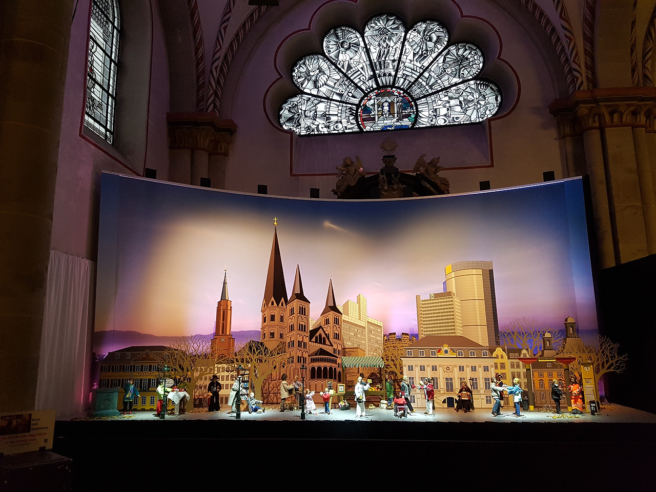 중앙광장에 설치된 크리스마스 마켓을 잠시 구경하다가 이 도시의 '크리페(Krippe)'가 성당에 설치되어 있다는 설명 문구를 보고선 성당으로 발걸음을 옮겼다. 본의 크리페는 지금껏 내가 마주한 독일 크리스 마켓 크리페 중에서 가장 신선했다. 그도 그럴 것이 과거와 현재의 본을, 그것도 본의 일상적인 모습과 대표 건물들과 함께 연출해 냈기 때문이다.