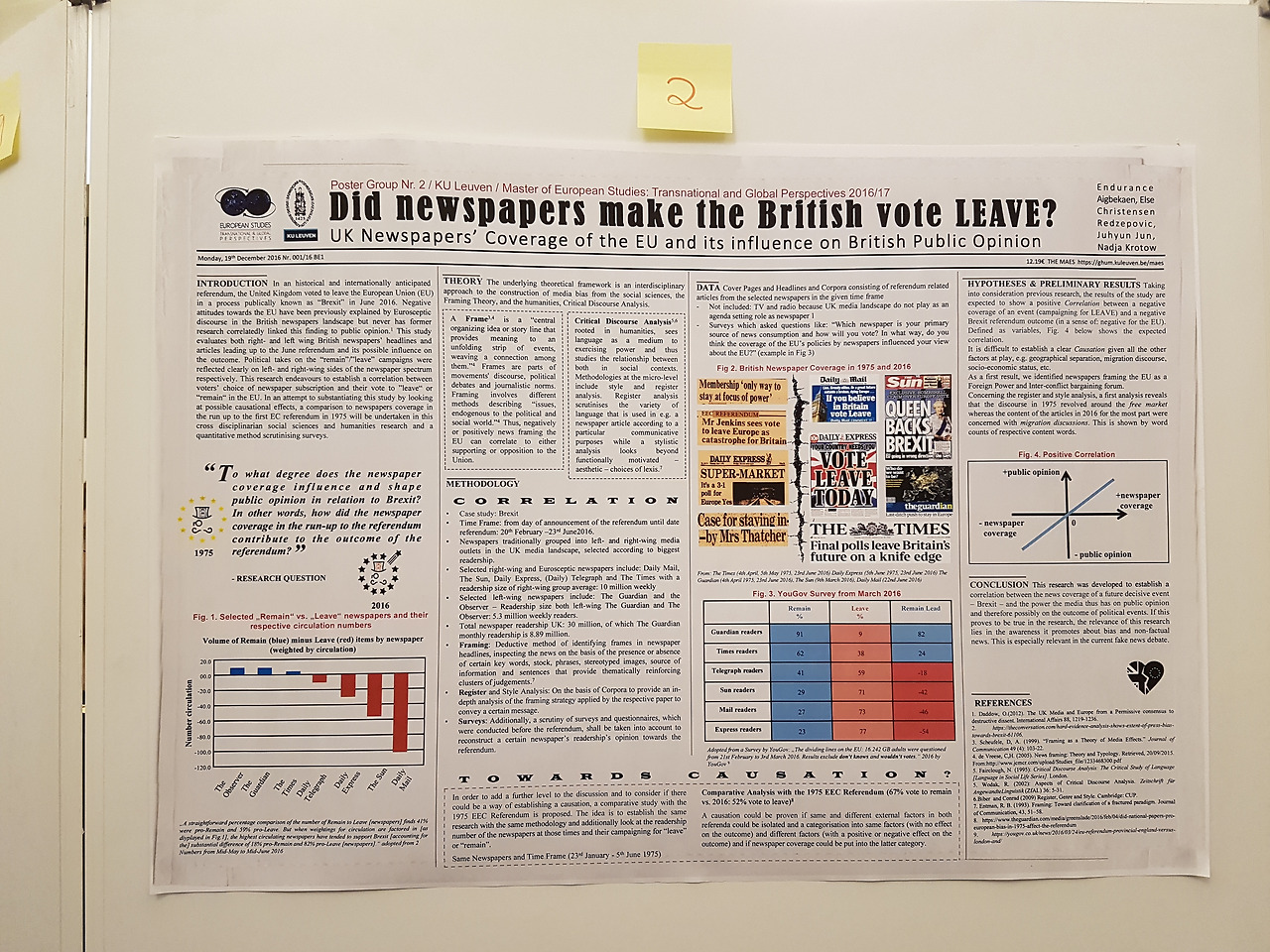 조별 과제 발표일이었던 오늘, 나는 포스터 발표 - Poster Conference - 라는 새로운 형태의 발표를 맡았다. 독일 친구 N과 덴마크 아주머니 한 분 그리고 두 명의 (이제는 더 이상 출신이 기억나지 않는) 동기들 이렇게 다섯 이서 준비한 발표다. 브렉시트에 관한 영국 언론들(그 중에서도 종이 신문들)의 보도 전략 및 영향력에 관한 내용을 담은 우리 조의 포스터는 뤼벤대 MAES(Master of European Studies) 교내 신문이라는 콘셉트를 가지고 포스터를 디자인했다.