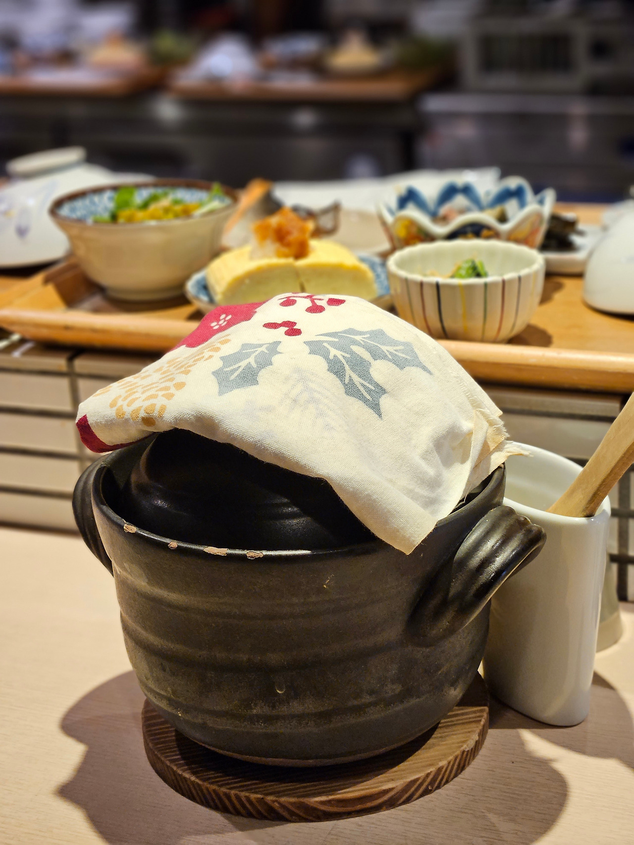 예약제로 운영되기에 대기 손님 눈치를 보면서 허겁지겁 먹을 필요도 없고, 조리 도구에서 나는 소리 외에는 별다른 소음도 없이 고요한 분위기니 다도를 배우는 수련생처럼 천천히 반찬 하나하나를 음미할 수 있었다. 밥도 국도 반찬도 따뜻한 기운이 가득하니 생수 대신에 제공해 주는 녹차물을 마시는 속도가 오반자이 하나하나를 먹는 속도에도 고스란히 반영되었다. 여행의 순간순간을 기록하고 싶은 마음에 이따금 카메라를 그릇 앞으로 들이밀기도 해야 하니, 밥 먹다가 할 일도 있는 거나 다름없었다. 옆에서 가마솥밥에 감탄하는 다영이에게 아침 외식을 하는 묘한 기분을 설명했다. 다영이는 혼자 여행 올 때와 다르게 둘이서 여행을 하니 맛있는 거 먹는 재미가 늘었다며 다음번엔 남편과도 와보겠다고 했다.