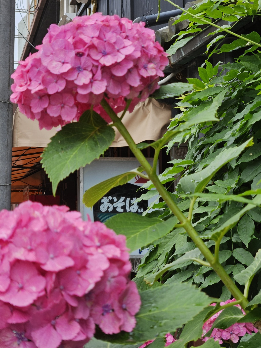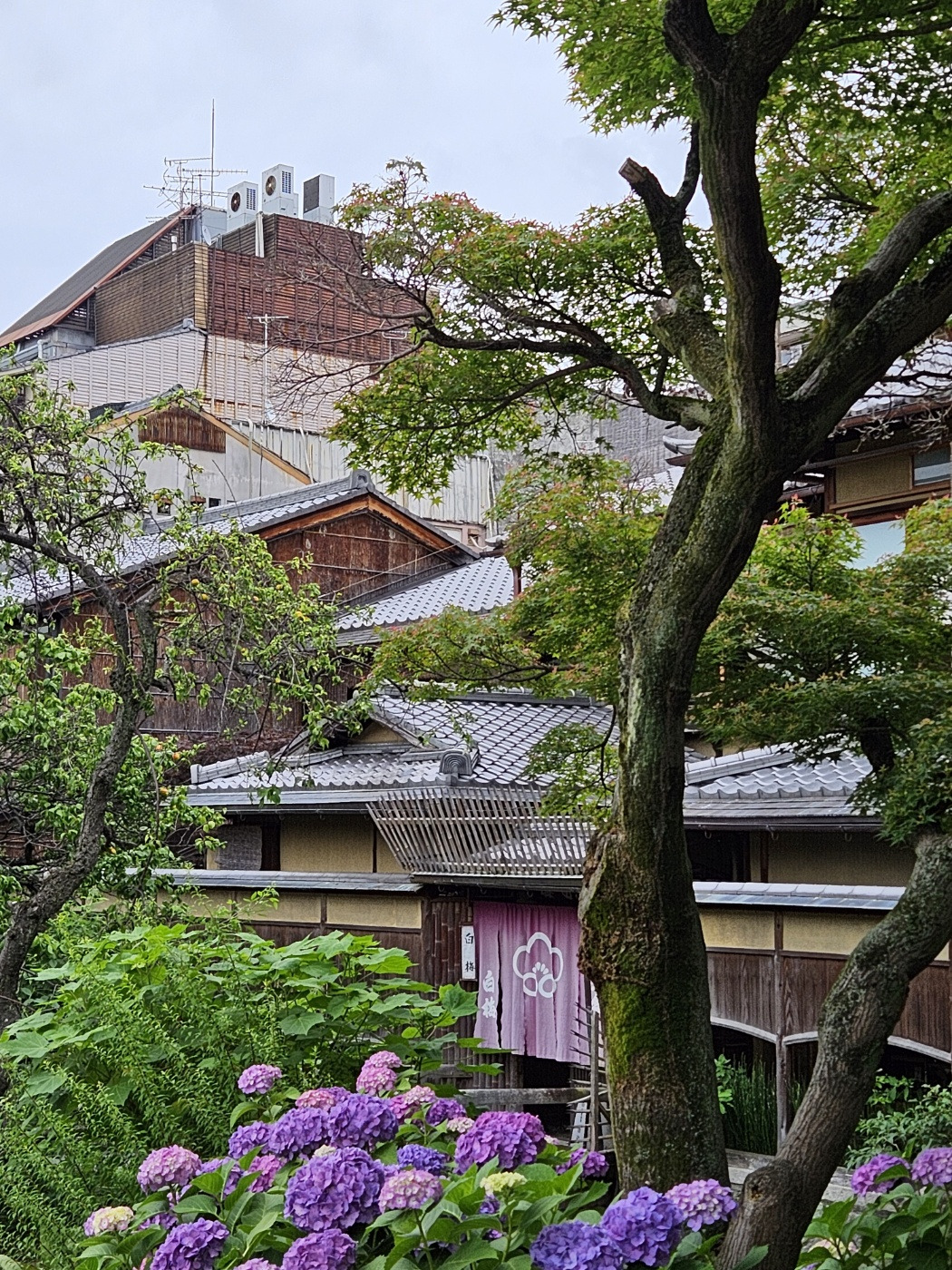다영이는 어떨지 모르지만, 나는 ‘꽃을 만나고야 말겠어! 사진도 엄청 찍어야지!’라면서 두 주먹 불끈 쥐고 떠나는 꽃놀이 여행을 굳이 계획하지 않는 편이다. 놀이를 핑계삼아 꼭 만나고픈 누군가가 있지 않는 이상, 출퇴근길이나 슈퍼마켓 다녀오는 길 위에서, 혹은 테이크아웃 주문을 넣은 커피를 기다리는 가게 안에서, 어쩌다 푸르고 알록달록한 것들을 눈에 담는 것으로 충분하다고 생각한다. 일상 풍경 속에 스며들어 있는 자연의 모습을 이뻐하는 게 왠지 더 ‘자연스럽다'라고 여긴다. 때문에 여행을 왔을 뿐인데, 거리마다 수국이 피어 있어 산책 내내 꽃놀이 아닌 꽃놀이를 할 수 있는 상황이 얼떨떨했다. 예상치 못한 보라, 파랑, 분홍, 연두 피사체가 일본의 전통 가옥과 어우러지고, 적당히 톤다운된 교토의 간판들의 차분한 분위기를 살려주는 풍경. 그야말로, 제대로 여름이었다. 운이 좋았다.