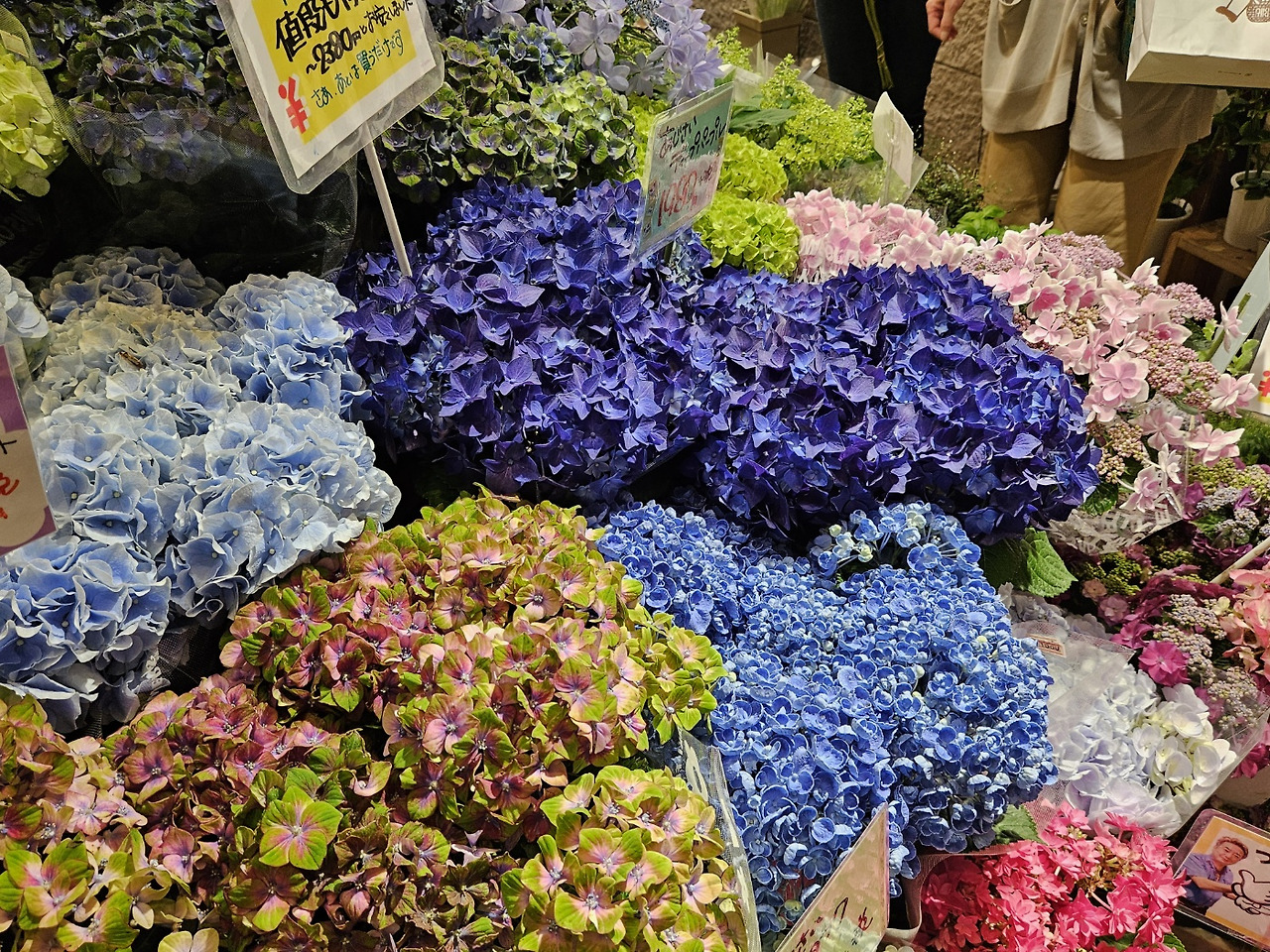 대기 중 수분기가 가득한 계절, 어딜 가나 수국이 보였다. 니시키 시장에서 각종 군것질거리를 사다가도, 벤리도에서 엽서 쇼핑을 하고 이노다 커피 쪽으로 걸을 때에도, 고등어 스시 가게를 지나 니넨자카 쪽으로 산책을 할 때에도, 우지에서 윤동주 시인의 자취를 따라 아마가세 다리 쪽으로 강변 산책을 할 때에도, 온통 수국이었다. 사무실에서 근근이 생명을 유지했던 한 다발과는 비교도 되지 않을 정도의 싱그러움이 꽃잎마다 가득했는데, 꽃잎 네 장을 한꺼번에 따서 물걸레 짜듯 비틀어 본다면 파스텔 빛깔을 한 단물이 뚝뚝 떨어져 나올 것만 같았다. 언제 빗방울이 떨어질지 모르는 여름 하늘 아래, 우중충한 하늘보다는 뙤약볕이 낫다면서 테루테루보즈(てるてるぼうず: 맑은 날씨를 기원하며 베란다나 지붕 끝에 매다는 종이 인형)의 마음으로 노심초사하던 우리의 모습과, ‘언제라도, 비가 온다면 즐거이 맞겠어요!’ 하며 땅 속에 뿌리를 내린 진녹색 수국 줄기의 늠름한 모습이 묘한 대비를 이뤘다.