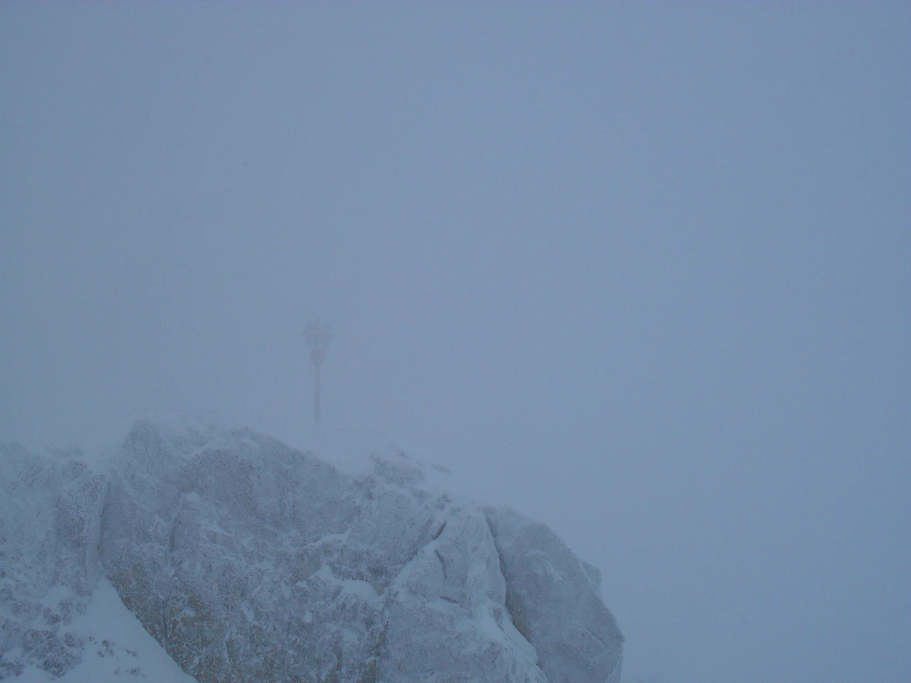돌산 위로 약간의 눈이 쌓여 있고 가장 위에는 금색의 십자가가 빛나고 있어야 하는데... 열차 정류장이자 매점이 있는 건물 내 복도에 걸린 사진과는 정반대의 풍경이 눈앞에 펼쳐졌다. 십자가의 금빛은커녕 실루엣만 흐릿하게 식별할 수준. 그 앞에서 다시 한번 허허하는 웃음소리의 사진을 찍었다.