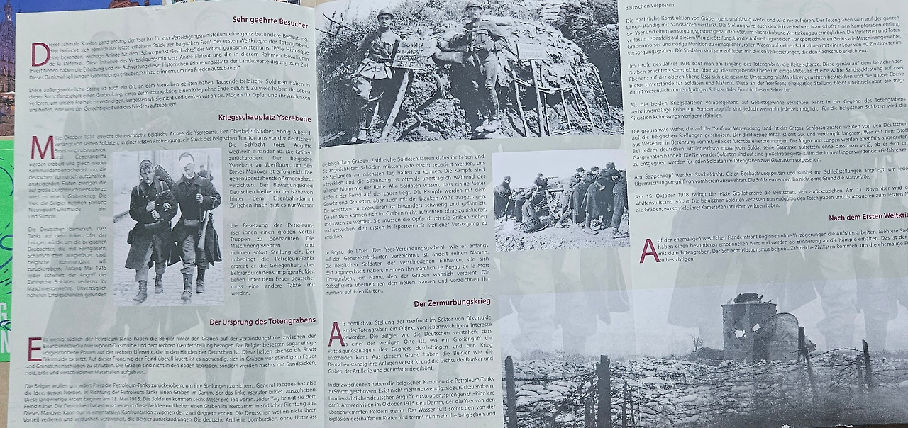 2쪽과 3쪽 사이에 2.5쪽처럼 끼워 넣은 큼지막한 팸플릿이 가장 먼저 눈에 띄네. 죽음의 참호(Trench of Death)라 불리는 1차 세계대전의 격전장 중 하나야. 주인장이 유로-아시아 썸머스쿨 당시 필드스터디를 갔던 곳 중 하나야. 이제르 강(Yser) 전투 때 수많은 벨기에 병사들이 이곳에서 목숨을 잃었지. 방문하면 참호를 걸어 다니면서 당시 긴박했던 상황을 떠올려 볼 수 있어. 생각보다 매우 좁고 깊대.