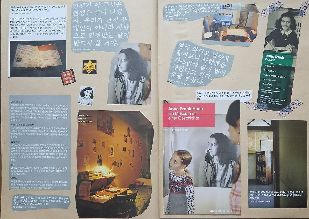오늘 소개한 4, 5 페이지에서 한참 페이지를 넘기다 보면 안네 프랑크의 집에서 나눠주던 한국어 팸플릿의 조각들을 두 쪽에 걸쳐 붙여 놓은 페이지가 나와. 추억상자의 구석진 곳에 입장권과 따로 놓여 있던 팸플릿을 찾아내고선 주인장이 신나서 붙였던 페이지지. 오로지 안네에게 헌정하는 페이지야. 그리고 독일어를 좋아하다가 이 지경(?)에 다다른 주인장 스스로를 위한 페이지이기도 해.