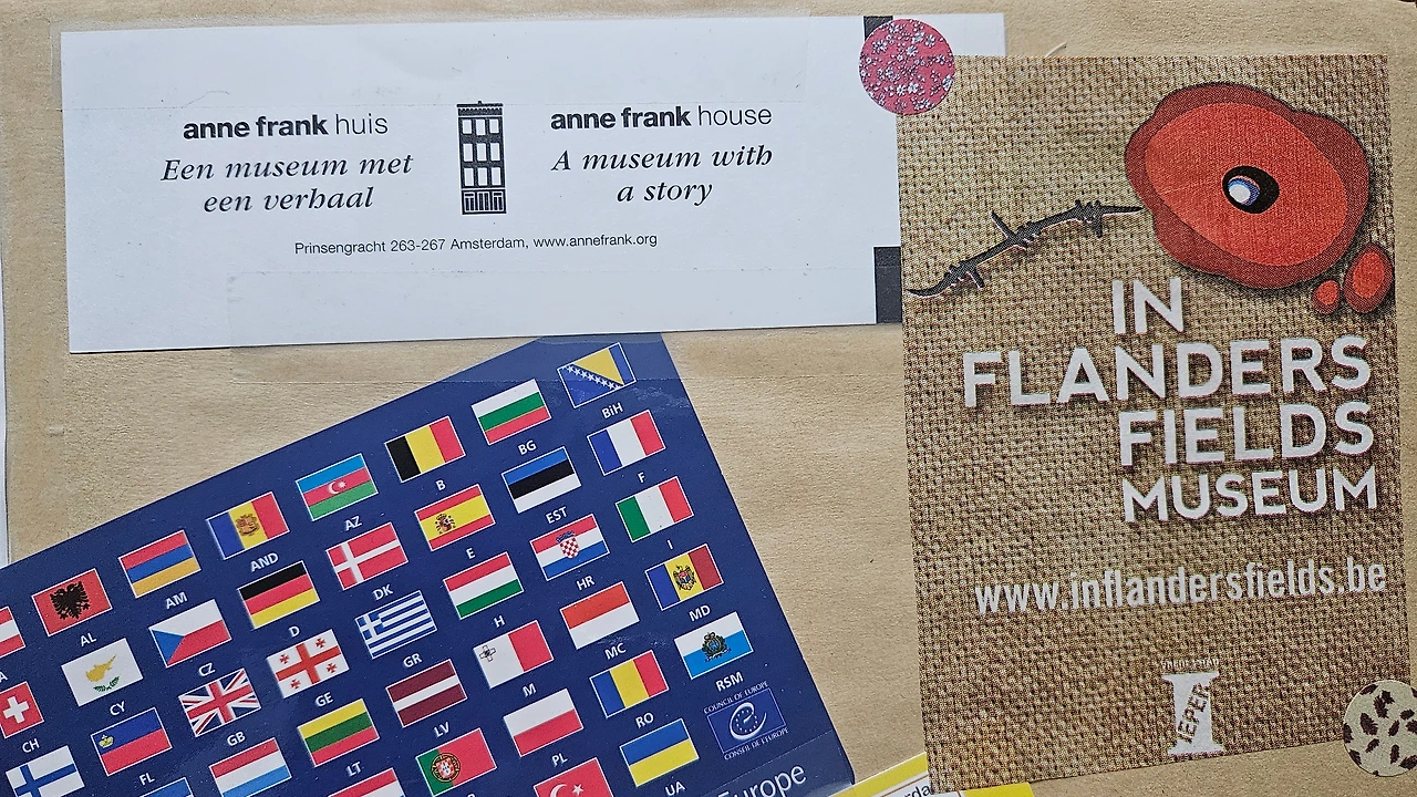수학여행에서 주인장은 1차 세계대전의 흔적들을 공동묘지와 박물관, 추모비 등으로 살피고, 전후 유럽의 평화를 위해 세워진 국제기구들(예를 들어, 우측 페이지에 파란색 네모 스티커로 붙어 있는 유럽평의회(Council of Europe) 같은 곳)을 방문했어. 전쟁의 흔적과 평화를 위한 노력, 그리고 죽음을 애도하고 사람을 귀히 여기려는 마음을 보고 배웠지.