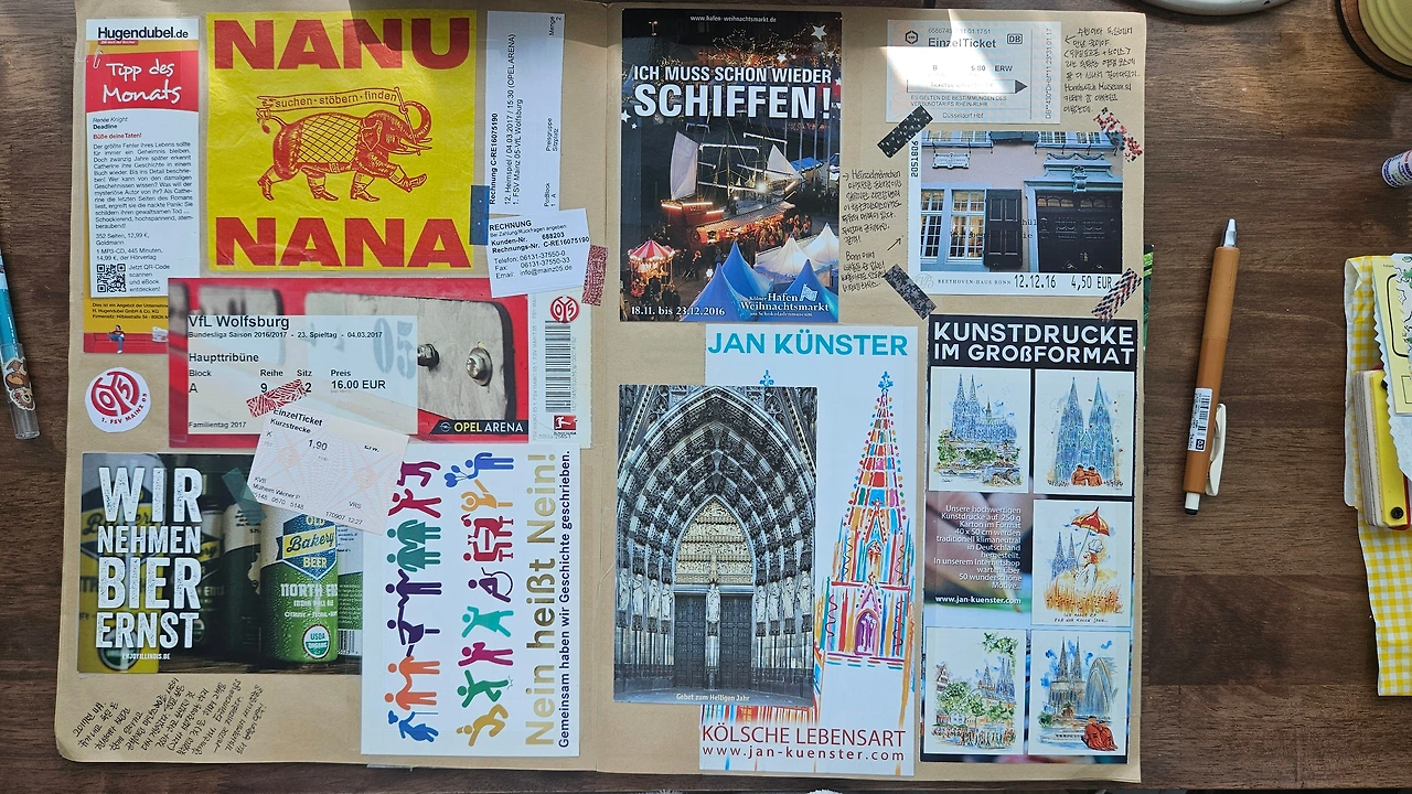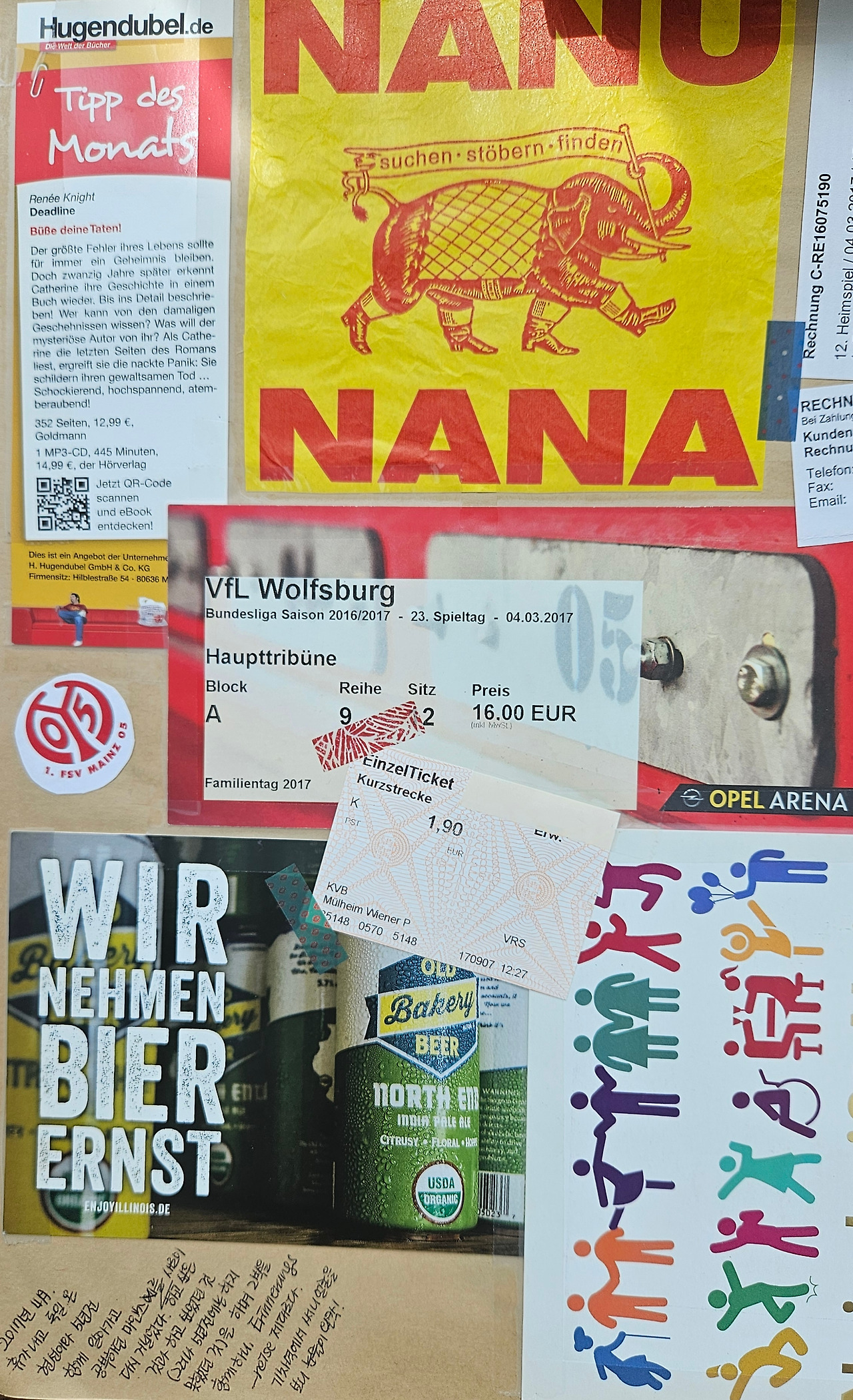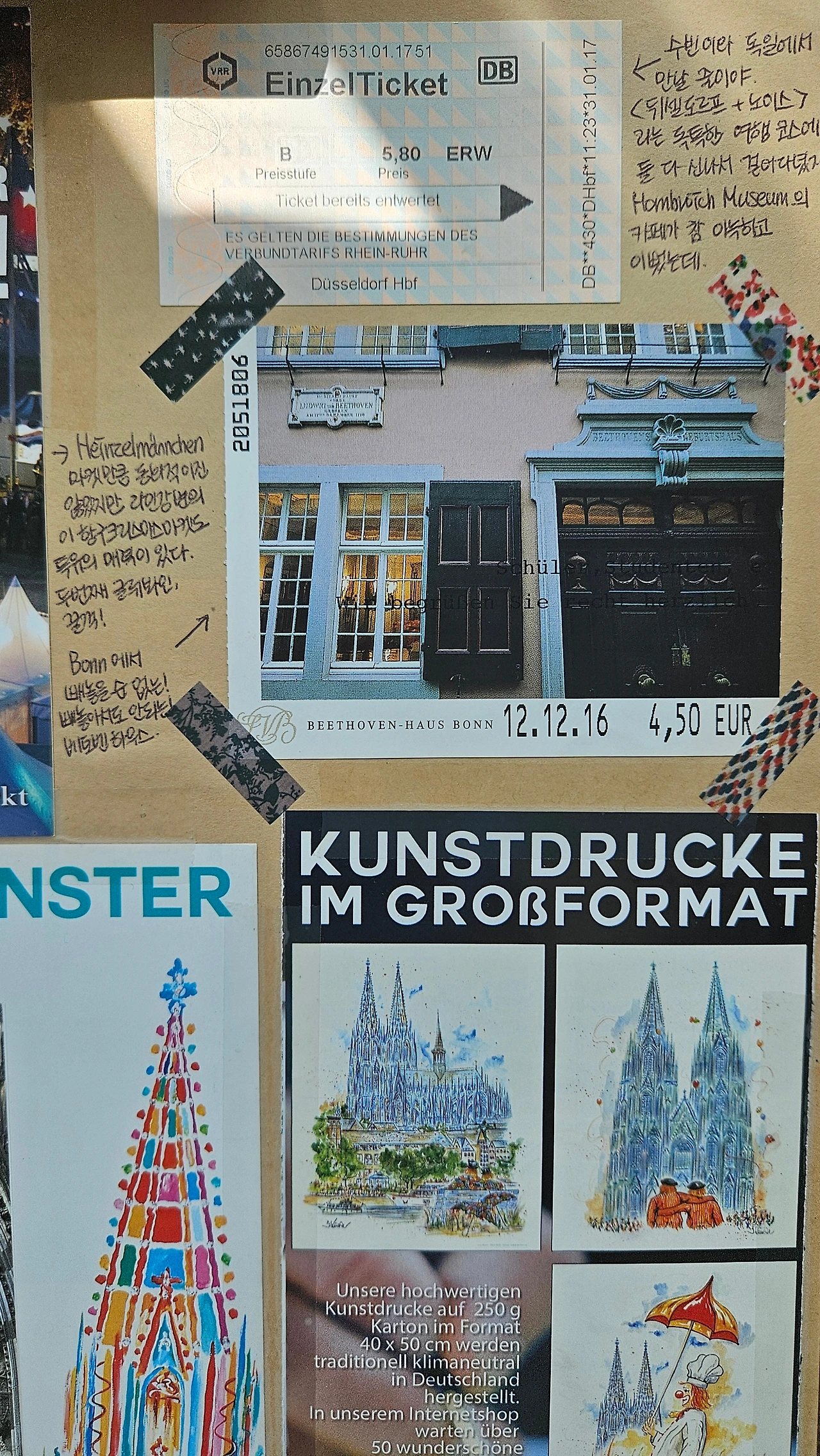 한국에선 굳이 모으지 않았을 것들을 간직하고 있다가 한 데 붙였어. 모두 독일에서 가져온 것들이야. 주인장 특성상, 독일에 관한 스크랩 자료는 차고 넘쳐. 내 밑에 있는 동생, 넘버 투 "감자"에 따로 정리될 정도지. 그런데도 내 안에 독일의 조각들이 이렇게 몇몇 담겨 있어. 말했잖아. 체계적이지 않게, 손에 집히는 대로, 추억상자에서 불쑥 꺼내 든 것들을 이리저리 붙이는 작업이기에 가능한 연출이라고. 즉흥성이 보장될 때 예상치 못한 결과가 나오잖아. 그 재미를 놓칠 수 없지.