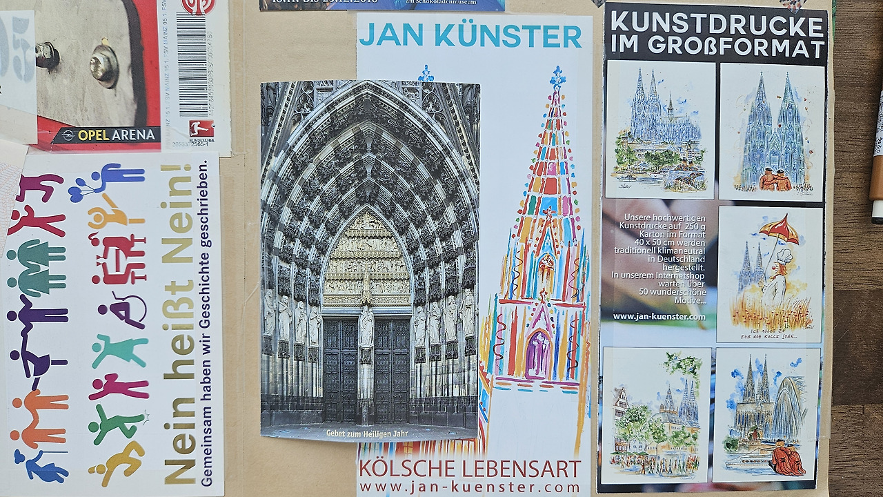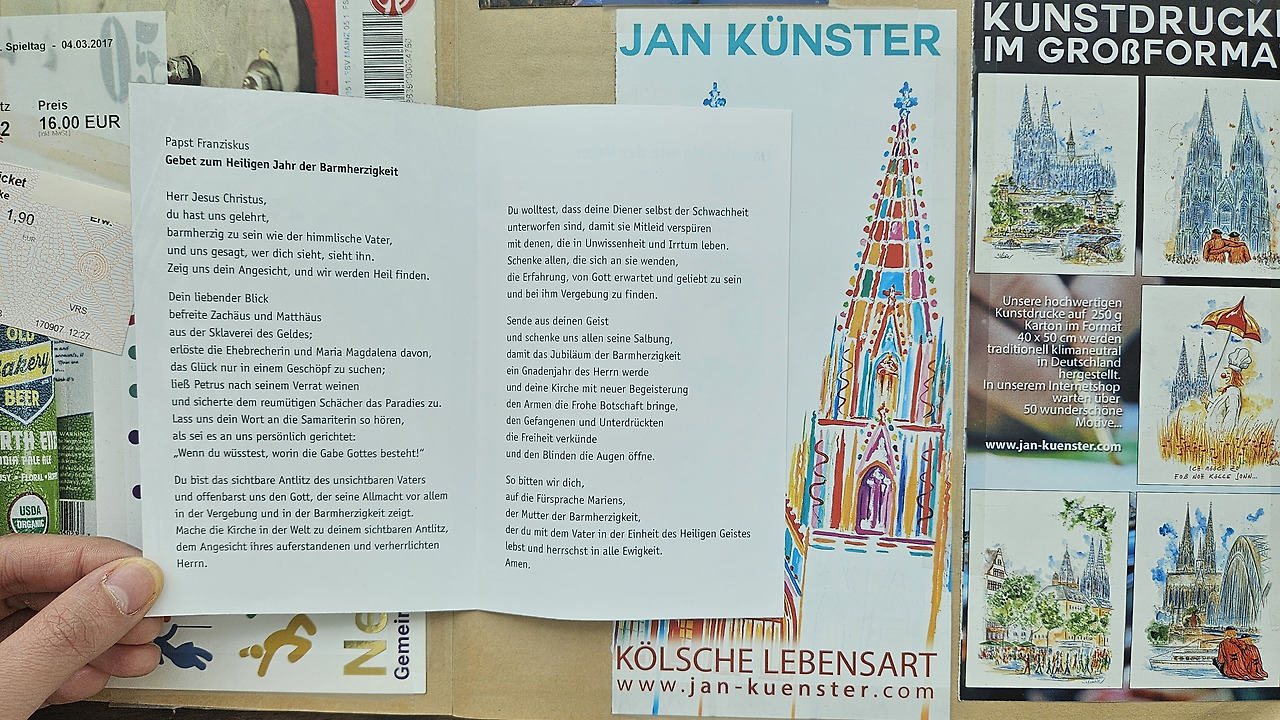 예를 들어, 왼쪽 상단부에 붙은 후겔두벨(Hugeldubel) 서점의 책갈피 홍보물을 보고선, '한국이었다면 책에 띠를 둘러서 방금 산 책에 관한 홍보를 좀 더 했을 텐데.' 하고. 마인츠 중앙역에 입점해 있는 잡화점 나누나나(NANU NANA)의 포장지를 보고선 '샛노란색에 붉은색이라니 맥도널드 포장지가 따로 없군. 아, 맥모닝 먹고 싶다. 조조영화라도 보면 먹을 수 있을 텐데. 요즘 극장에서 뭐 하지?' 하며 입맛을 다시고. '아빠라면 맥주 얘기보단 막걸리 얘기할 때 궁서체를 쓰겠지.' 하면서 비어(Bier; 맥주) 관련 홍보물을 내려놓고 아빠에게 문자 메시지를 보내고. 쾰른 대성당에 비치된 기도문(오른쪽 페이지 좌측 하단부)을 읽으면서 최근에 간절히 기도했던 것들이 무엇이었는지 되돌아보지.