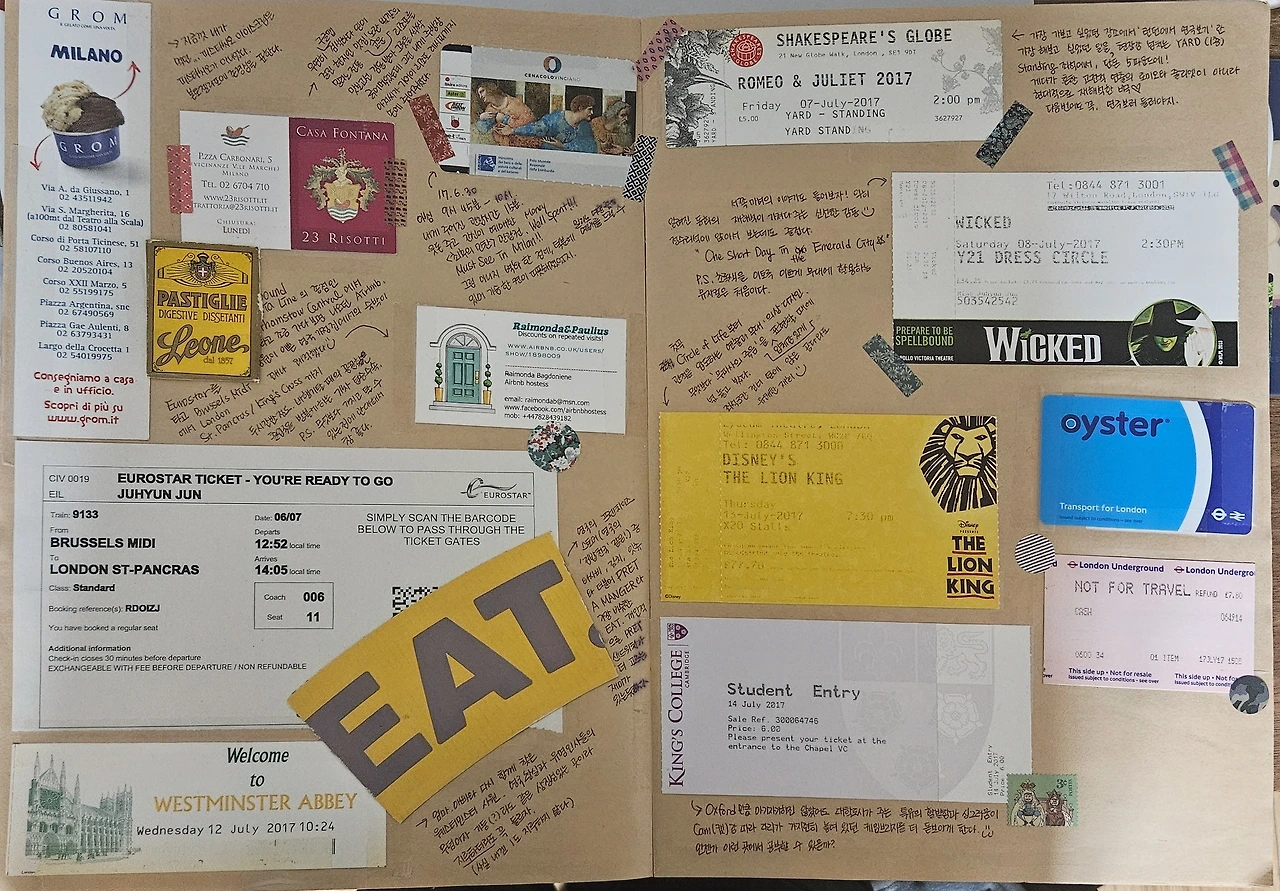 그런데 요즘엔 그런 재료들을 찾기가 꽤 힘들더라. 온라인 티켓이나 QR코드 티켓의 사용이 많아지면서 굳이 아날로그 표를 끊어주지 않더라고. 한편으론 종이 소비가 줄어서 조금 더 많은 나무들을 살릴 수 있겠구나 싶다가도, 손으로 만져지는 무언가가 없고, 이렇게 정석적으로 노트를 채울 스크랩북 재료가 없다고 생각하니... 아쉽긴 해.