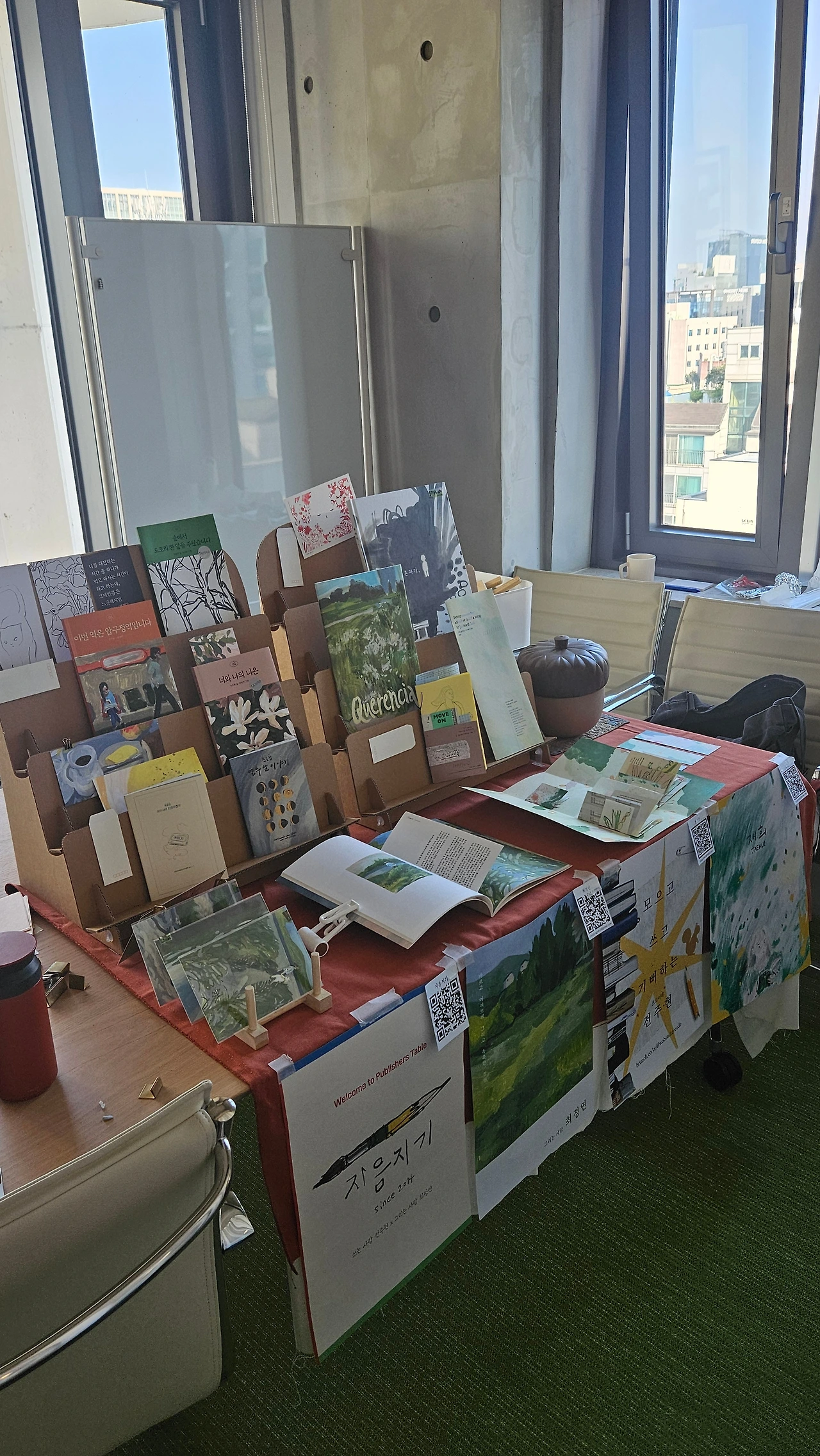 C-13. 우리 부스 앞에 서서 전날 퇴근하면서 덮어 두었던 가림막을 테이블 아래로 내렸다. 어제와 똑같이 책들을 진열하고 소품을 점검했다. 독자님들을 만나기 전에 머리도 한번 질끈 다시 묶었다.