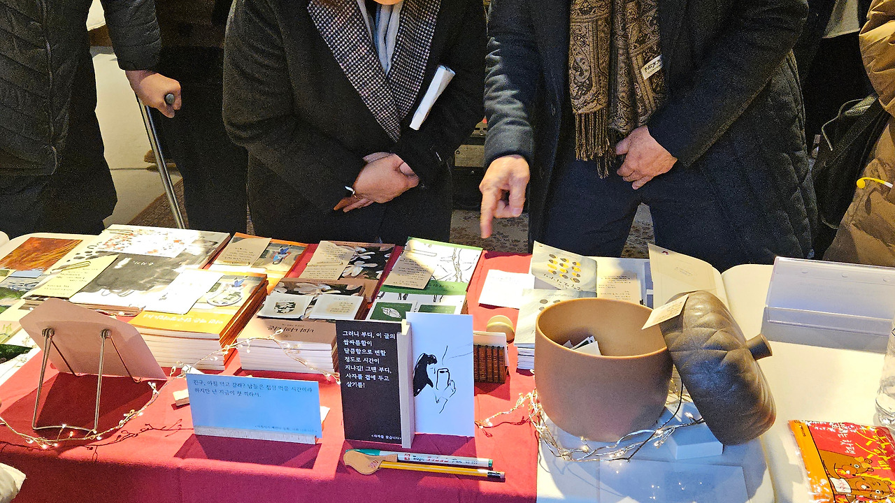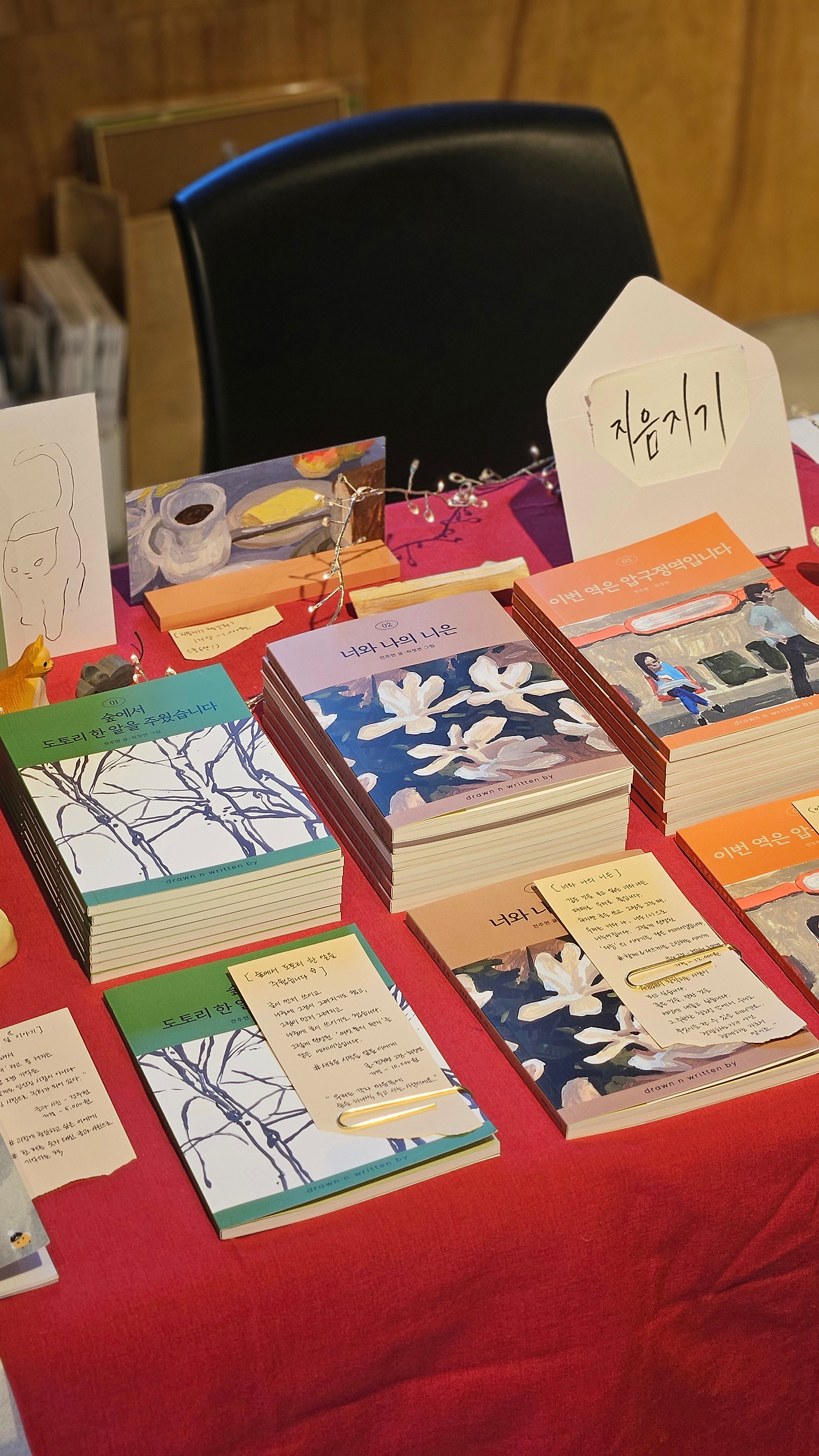 단 하루동안 진행되는 행사였지만 방문객이 끊임없이 찾아왔다. 아이와 강아지를 동반한 손님들이 많았고, 가족 단위로 오신 분들도 꽤 있었다. 뜨끈한 난로 주변에서 몸을 녹이는 강아지들과 지음지기의 인형들을 알아봐 주던 아이들 덕분에 흐뭇한 미소가 떠나질 않았다. 북페어 종료까지 1시간 정도 남았을 땐 장내 혼잡도가 최고조에 달했는데, 그때 한 중년의 부부께서 우리 부스를 찬찬히 살펴 주시던 게 생각난다. <숲에서 도토리 한 알을 주웠습니다>부터 <이번 역은 압구정역입니다>까지 한 권씩 설명을 드렸다. 설명이 끝난 뒤로도 책을 찬찬히 보시던 어르신께선 이렇게 말씀하셨다.