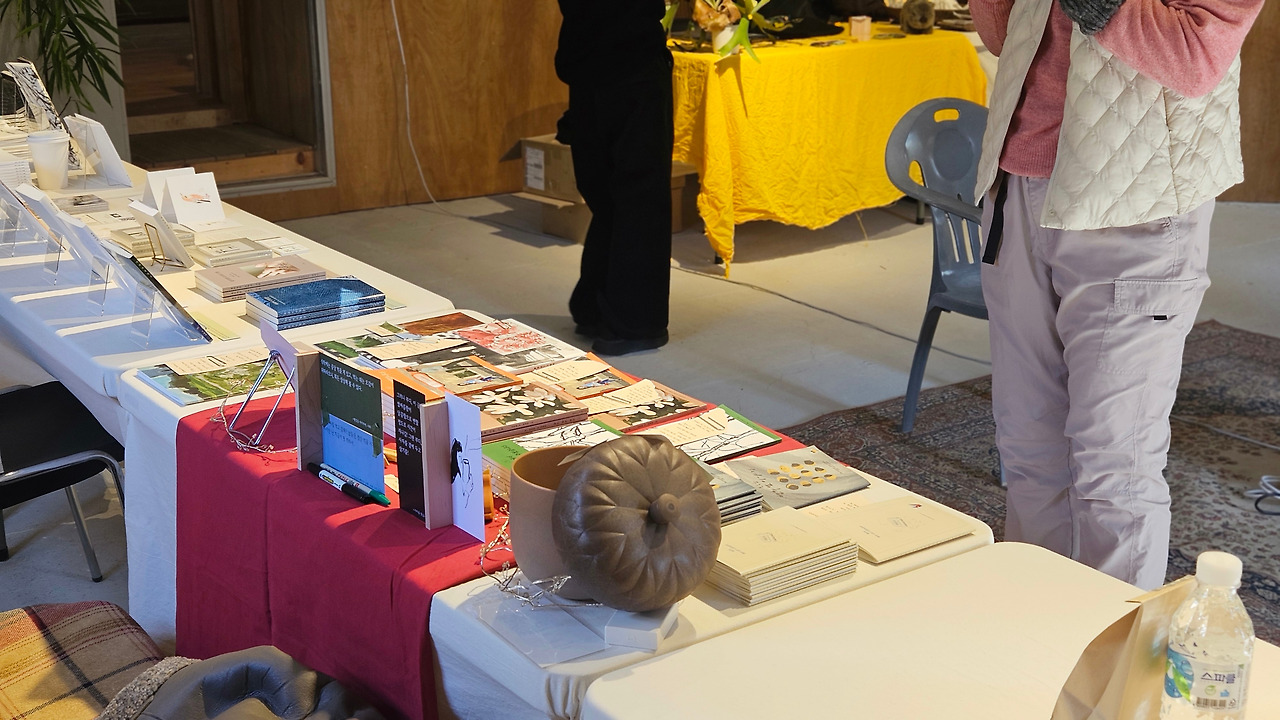 역 근처에서 이른 점심을 해결하고 파타르로 향했다. 단정한 나무 문 옆으로 심은 갈대(?)가 좌우로 몸을 흔들며 우리를 반겨주었다. 입장과 동시에 가운데 난로를 기준점으로 디귿(ㄷ) 모양으로 한데 모인 부스들이 보였다. 엔틱한 카펫 위에 열기를 내뿜는 난로라니, 오래된 교실에 들어온 것처럼 아련해졌다. 우리를 알아본 태순 작가님과 스태프 분들이 인사를 건네셨다. 초대해 주셔서 너무 감사하다고, 공간이 아름답다고, 대전 땅을 밟은 건 오늘이 거의 처음인데 기대된다고, …. 스몰 토크를 나누는 사이에 난로 열기로 두 뺨을 붉게 데워졌다.