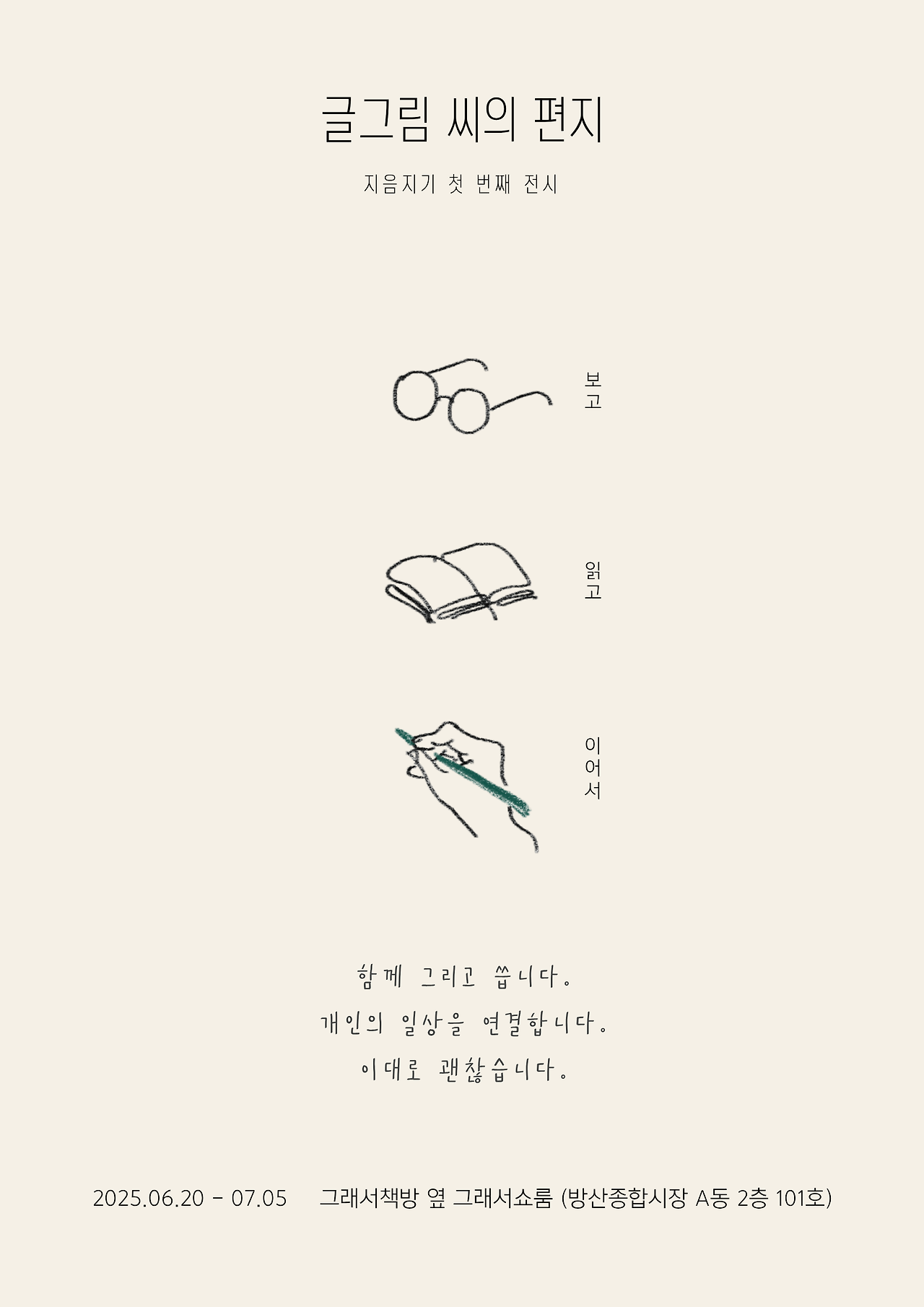 당신에게 숙제를 주고자 합니다. 어디까지나 당신을 위해 제안하는 겁니다. 우선, 편지를 손에 쥔 채 방산시장 A동 그래서 책방의 쇼룸으로 가세요. 그곳에서 창작의 재료를 보고, 읽고, 그 뒷이야기를 직접 이어서 그리거나 써주십시오.