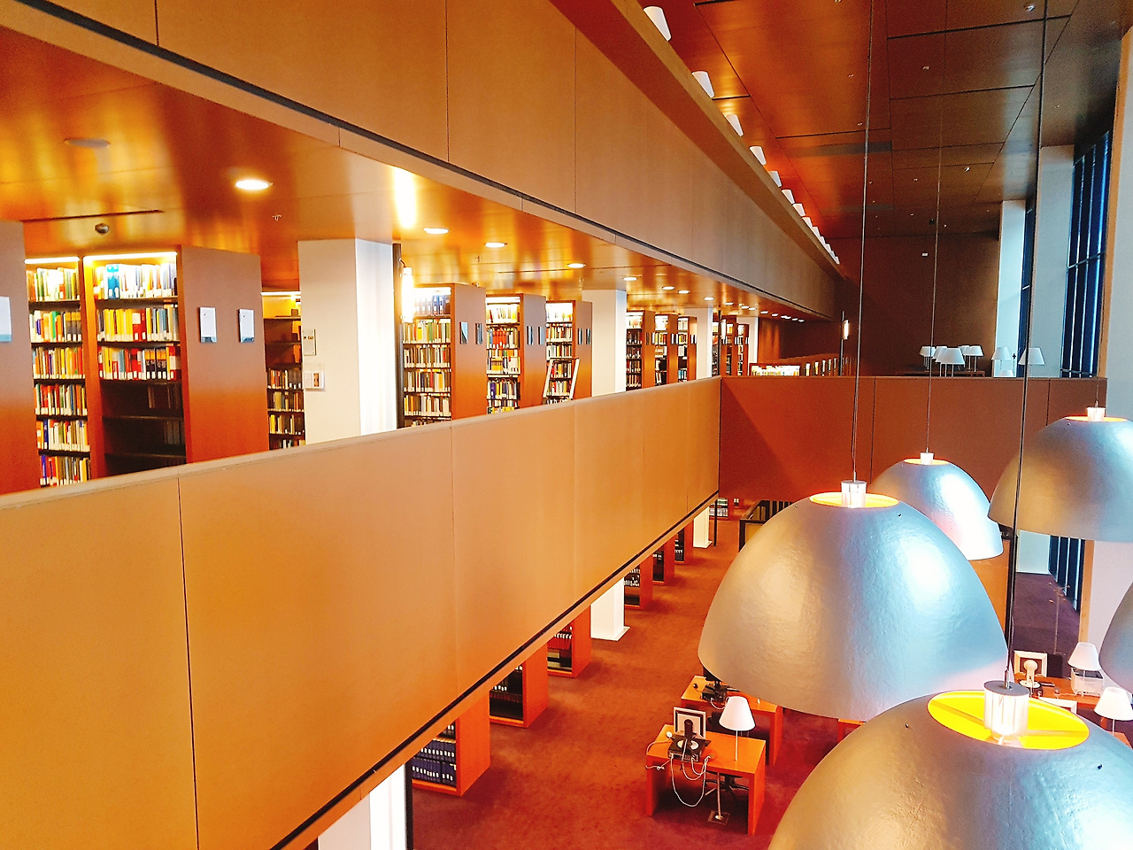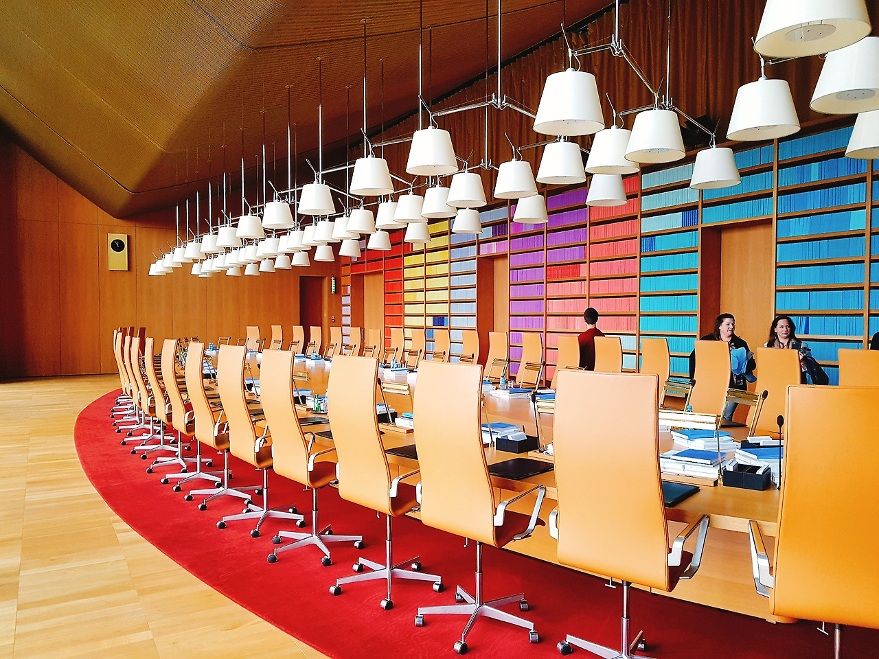 재판소에 도착하자마자 우리가 가장 먼저 한 것은 Lenaerts 재판관의 특강을 들은 것! 전공 수업 때 들었던 내용과 크게 다른 이야기가 오고 가진 못해서 특강 뒤에 손에 쥔 ECJ USB 선물이 가장 기억에 남는다(허허). 그 이후에는 ECJ 도서관과 판례집 서가를 구경하며 약간의 자유시간을 가졌다. ECJ 도서관에는 나라별로 법학 전문 서적들을 정리해 놓은 곳이 있었는데, 그곳에서 독일법 코너를 찾아가 로스쿨 준비에 한창이던 학교 후배를 위해 인증샷을 찍어 보냈다. 판례집들은 주제별로 제본 표지 색을 달리 하고 있었는데, 어느 정리꾼(?)의 손길을 탔는지 알록달록하는 와중에 각이 제대로 잡혀 있었다. 내부를 둘러보면 볼수록 ECJ가 재판소로서 차갑고 딱딱한 이미지를 밀고 나가기보다는 일종의 박물관이자 복합 문화공간 같은 인상을 만들어하고 싶다는 느낌을 받았다.