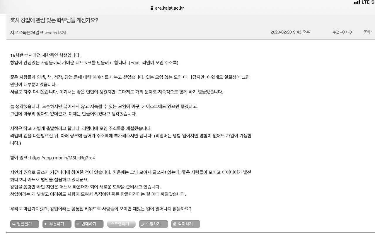 카이스트 안에서 창업 모임이 있으면 좋겠다고 생각했다. 어디 좋은 곳 없나, 늘 찾아 다녔다. 창업부전공 프로그램도 참가해보고 창업가들과의 만찬에도 참석했지만 그 순간 뿐이었다. 머릿속에 그리던, 느슨한 유대로 이뤄진 지속적인 모임은 없었다. 함께 공부하고 성장하는 모임. 재밌는 아이디어가 있으면 대번에 실행해 결과물을 만드는 팀.