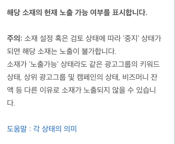분명히 광고 캠페인을 확인했을 때는 별 문제가 없었다. 만약 노출에 문제가 생기면 아래 이미지에서 상태를 확인했을 때 노출가능이 아닌 다른 문구가 떠야 한다고 설명이 나와있었다 하지만 상태는 멀쩡했다. 광고가 “노출가능”이라고 분명히 떠 있었단 말이다.