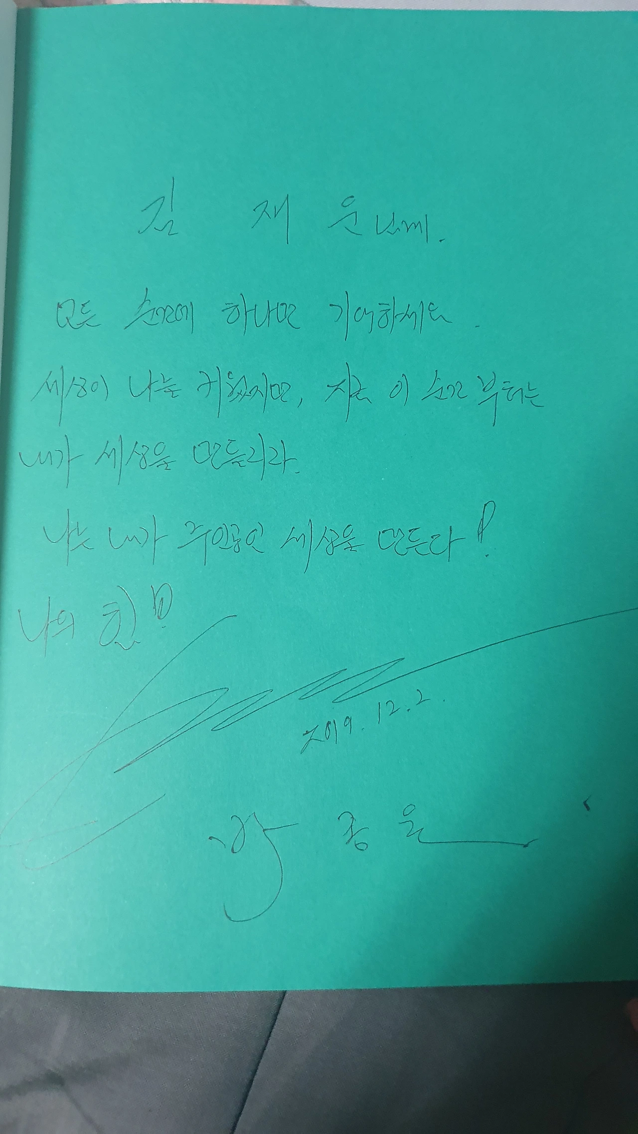 “김재운 님께. 모든 순간에 하나만 기억하세요. 세상이 나를 키웠지만, 지금 이 순간부터는 내가 세상을 만들리라. 나는 내가 주인공인 세상을 만든다! 나의 힘! - 2019.12.2 박종윤”