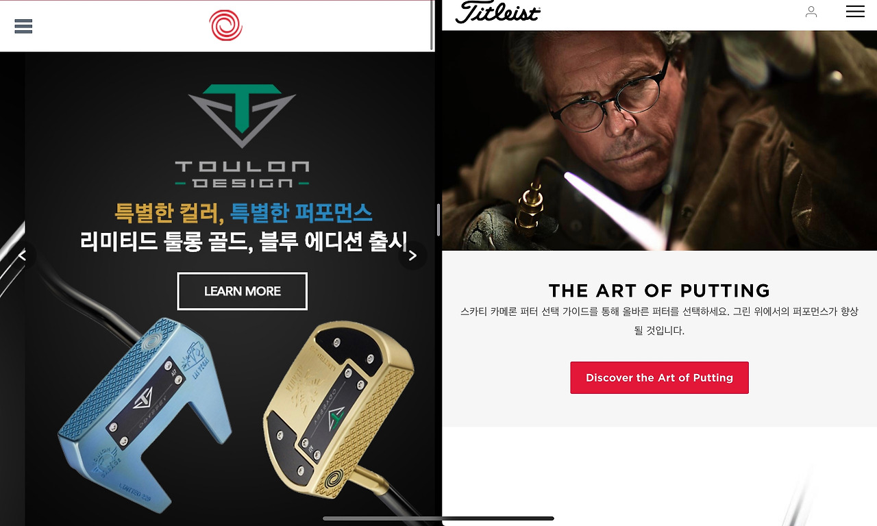 가장 먼저는 우리의 경쟁사다. 이미 탄탄한 입지를 다지고 있는 퍼터 브랜드인 오딧세이, 스카티 카메론 등이 여기에 속한다. 이외에도 내놓으라 하는 퍼터 브랜드가 많지만, 크게 두 가지 방향에서 위의 브랜드를 살펴봤다. 웹사이트 메인 페이지만 보아도 확연히 다르다는 게 느껴진다.