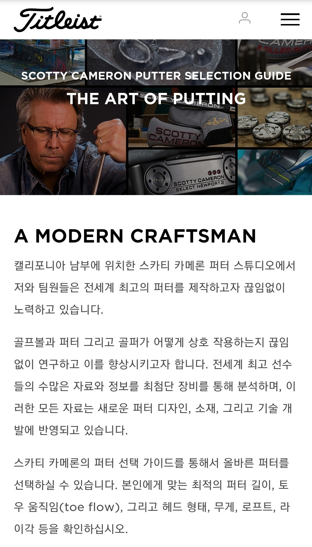 반면, 명품을 지향하는 수제 퍼터 브랜드인 스카티 카메론은 조금 다르다. 디자이너가 작업하는 모습이 먼저 나온다. 그리고 그 밑에는 The art of putting이라는 한 문장이 적혀있다.