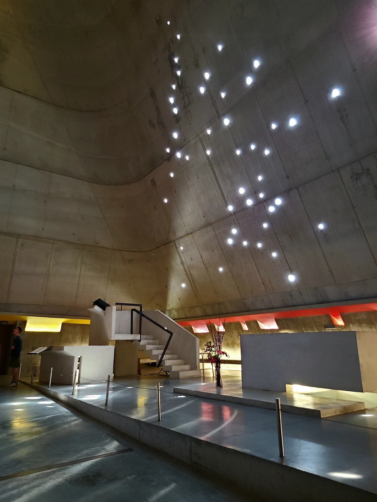 이렇게 통으로 콘크리트로 된 거대한 구조 때문인지 이곳에서 느껴지는 분위기가 특이했다. 예배당의 남쪽 벽면에는 구멍들이 뚫려있었는데, 이 구멍들이 만드는 효과는 놀랄 정도로 드라마틱했다. 직사광이 들지 않는 어두운 예배당 내부에서 해가 있는 남쪽으로 과감하게 구멍들이 뚫려있었고, 예배당 벽면이 별빛으로 가득 찼다.