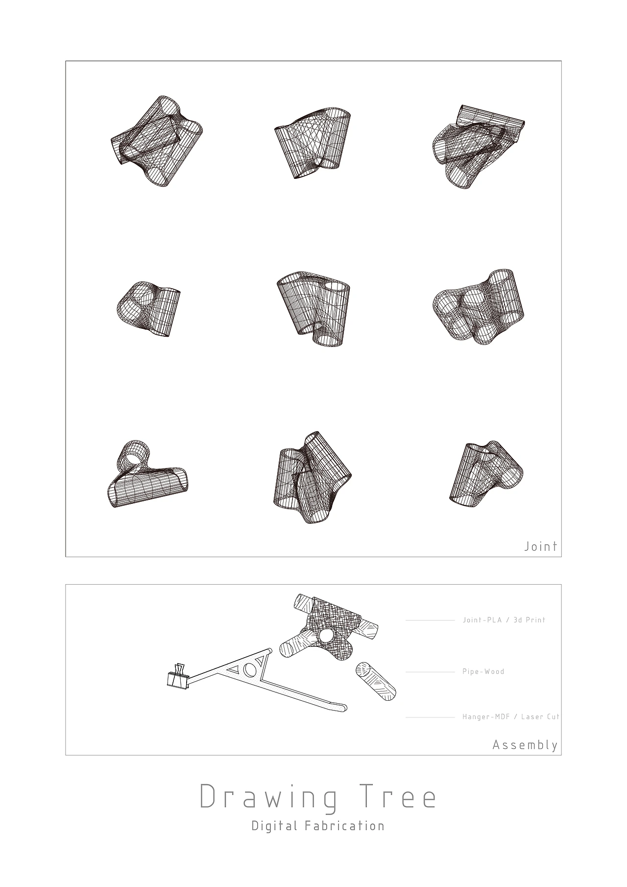 이 도면거치대의 프레임이 되는 막대는 목봉을 잘라서 사용하고, 이 목봉끼리 고정하는 부품을 3d 프린터로 만들었다. 그리고 종이를 매다는 부분은 MDF를 레이저커팅해서 목봉에 끼우고, 집게를 달아서 종이를 잡는 방식을 썼다.