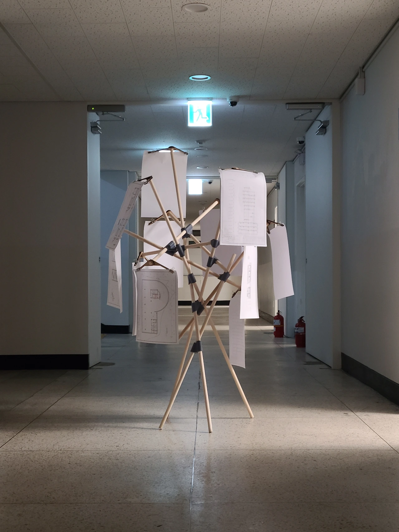 자유도가 높은 프로젝트인 만큼 눈길을 끌 수 있는, 약간은 괴상한 것을 만들어야겠다고 생각했다. 마침 통합설계를 하고 있었던 때라 내 책상에는 수많은 도면들이 널브러져 있었고, 그중에는 벽에 걸어두고 보고 싶은 도면들도 있었다. 그래서 이런 가구를 떠올렸던 것 같다.