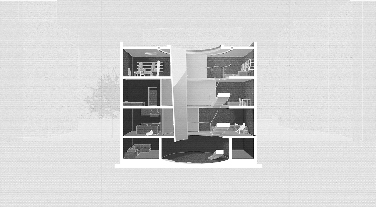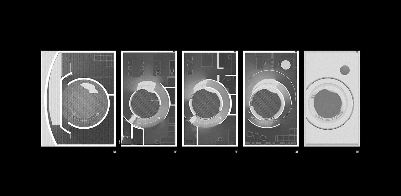 주택은 지하 1층부터 지상 3층까지 있고, 한 가족이 거주하는 주택이다. 4개의 층이 있는 만큼 공간들의 배치는 아래층에 가장 어두운 공간부터 꼭대기로 갈수록 가장 빛이 많이 필요한 공간의 순으로 배치했다.