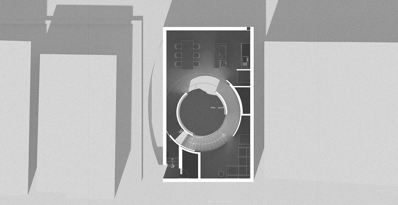 지하 1층의 중정은 하늘에서 내려오는 빛에 집중할 수 있도록 주위를 둥근 콘크리트 벽으로 감쌌다. 대신 실내의 영화관, 다용도실 공간은 필요시에 빛이 들어올 수 있도록 드라이에어리어를 접하게 했다. 조금이나마 있는 서쪽의 대지를 활용했다.