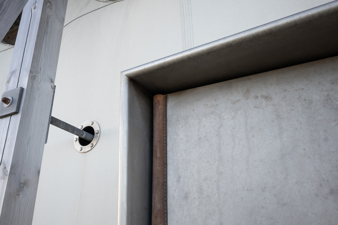 목재 프레임에 매달려 있는 듯 전시관은 두꺼운 직물로 되어있었다. 천으로 만들어져 있었기에 문이나 각종 프레임들과 이 천 같은 소재가 만나는 방식이 재미있다.