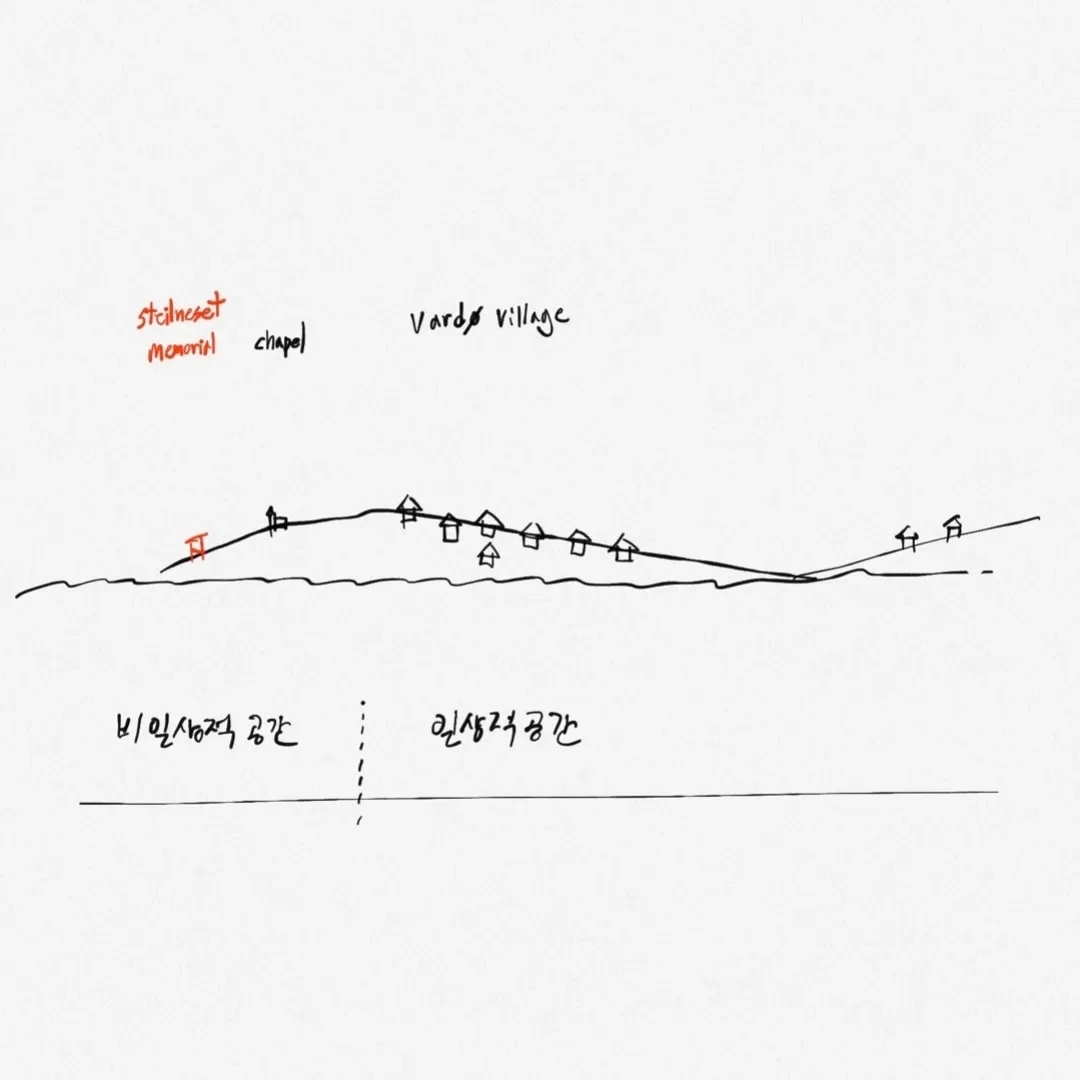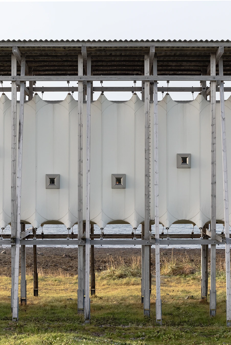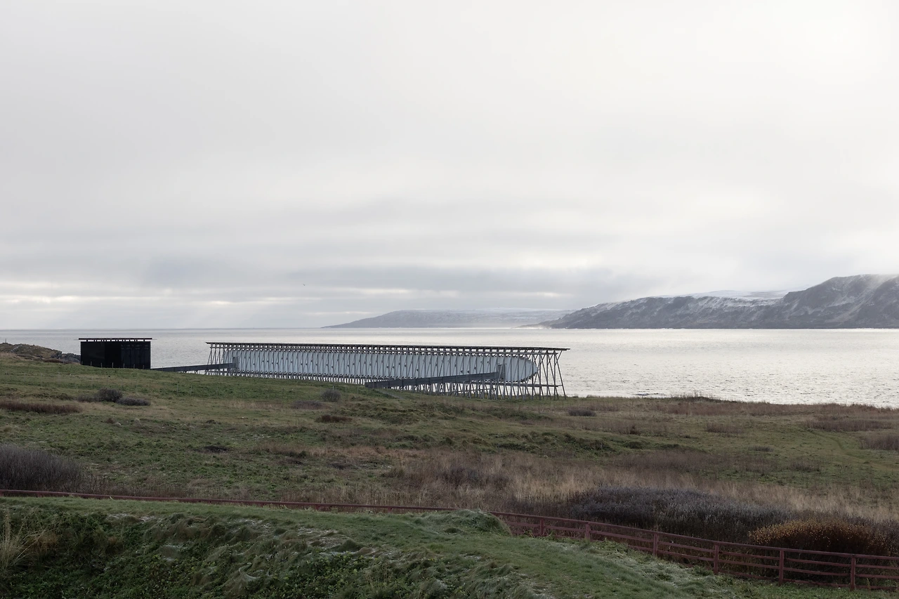 이 지역은 돌아다니다 보면 목재로 된 커다란 구조물들이 들판에 서 있는데, 생선을 말리기 위한 것이라고 한다. 대략 한 3~4미터 정도 높이로 꽤나 큰 구조물 자체도 참 범상치 않다. 아무튼 메모리얼의 재료와 형태에 있어서 저 생선을 말리는 건조대가 영감이 된 것으로 보인다.