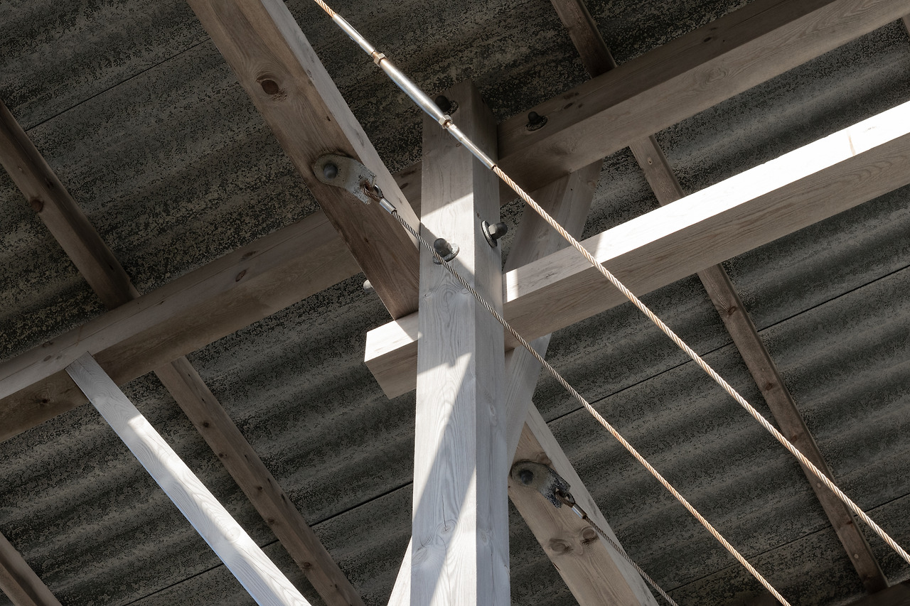형태는 조금 특이한 구조물이지만, 단순한 재료와 솔직한 방식으로 만들어졌다. 목재 프레임과 철재와이어가 주로 쓰였고, 외피는 직물, 지붕은 일종의 슬레이트가 쓰였다. 본 재료의 특성을 최대한 유지하는 춤토어의 스타일이 보인다. 나무는 나무로, 금속은 금속으로, 패브릭은 패브릭으로 그 특성을 드러내는 것이다.