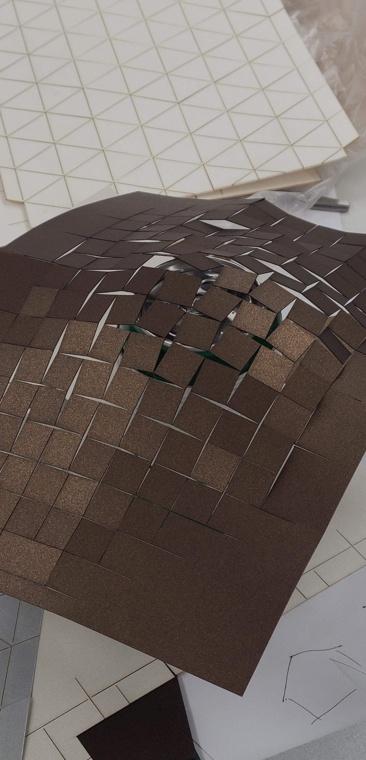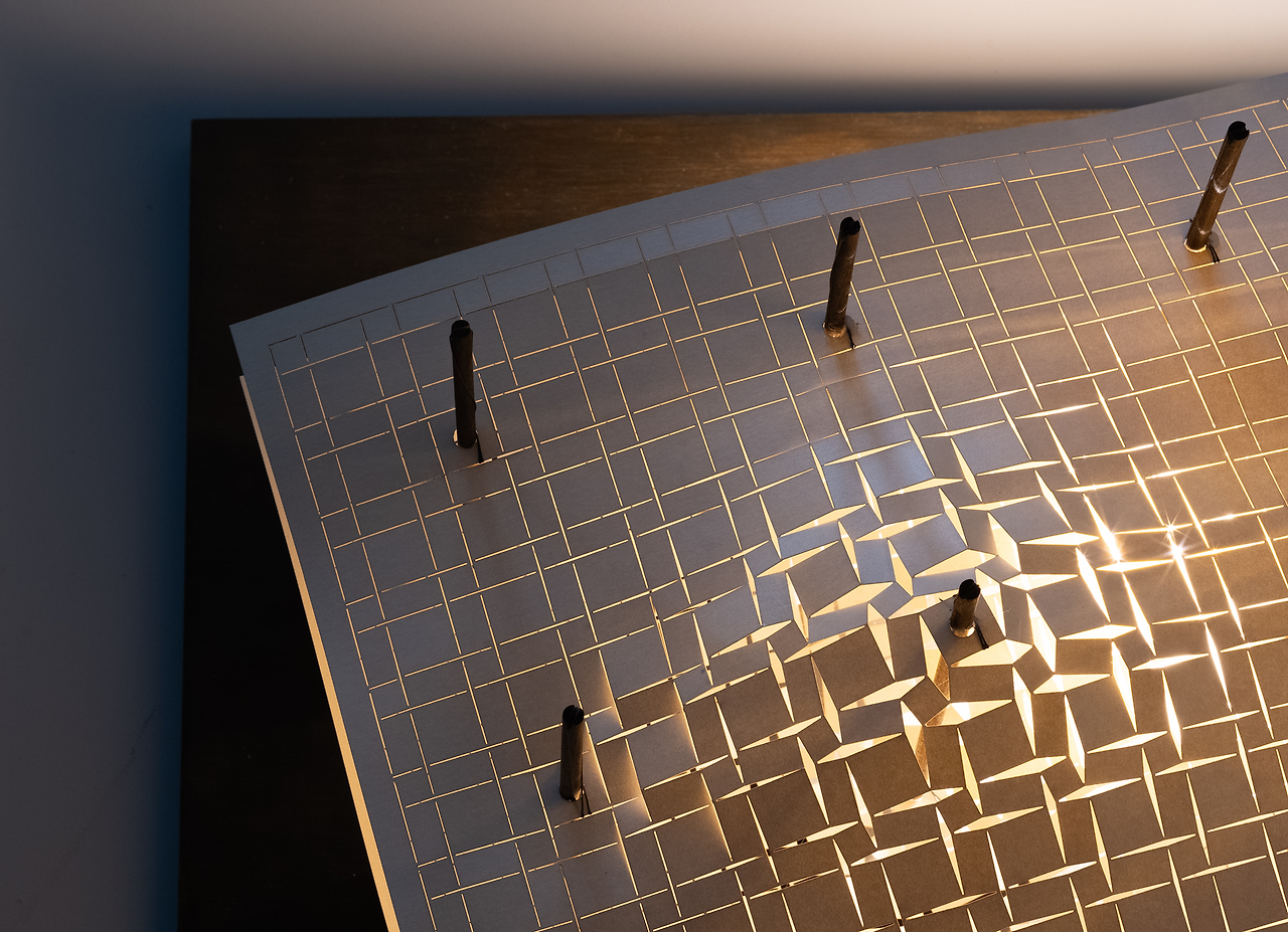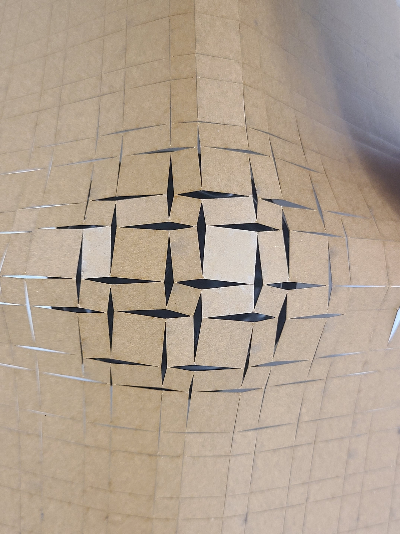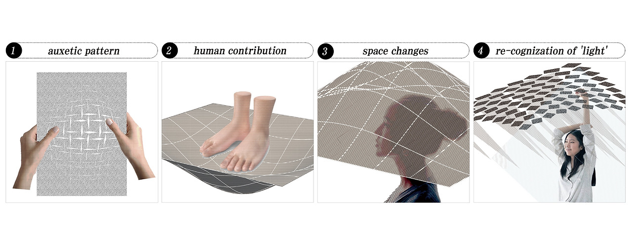 사람들이 위치한 곳에 공간이 생기는 만큼, 그곳에 자연광이 들도록 하는 것도 고민했다. 우리가 주목한 것은 auxetic 패턴들이었다.(이걸 한국말로는 대체 뭐라고 부르는지 모르겠다) auxetic구조는 약간의 탄성이 있는 재료들이라면, 종이 같은 막으로 만들었을 때 이것이 3d로 구부러지고 다시 펴질 수 있는 성질을 가진다. 섬유로 이루어지진 않더라도 직물과 같은 성질을 가질 수 있는 것이다. 이 패턴은 늘어날 때에 패턴 사이에 넓은 빈 공간들을 만들 수 있어서 유연하게 입체적으로 변화할 수 있다.
