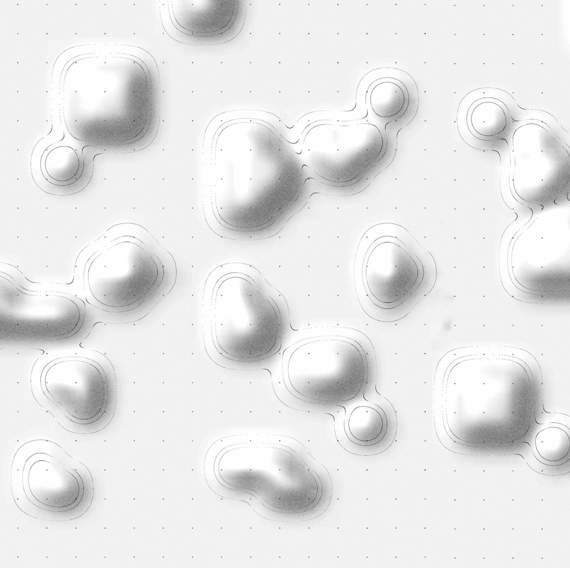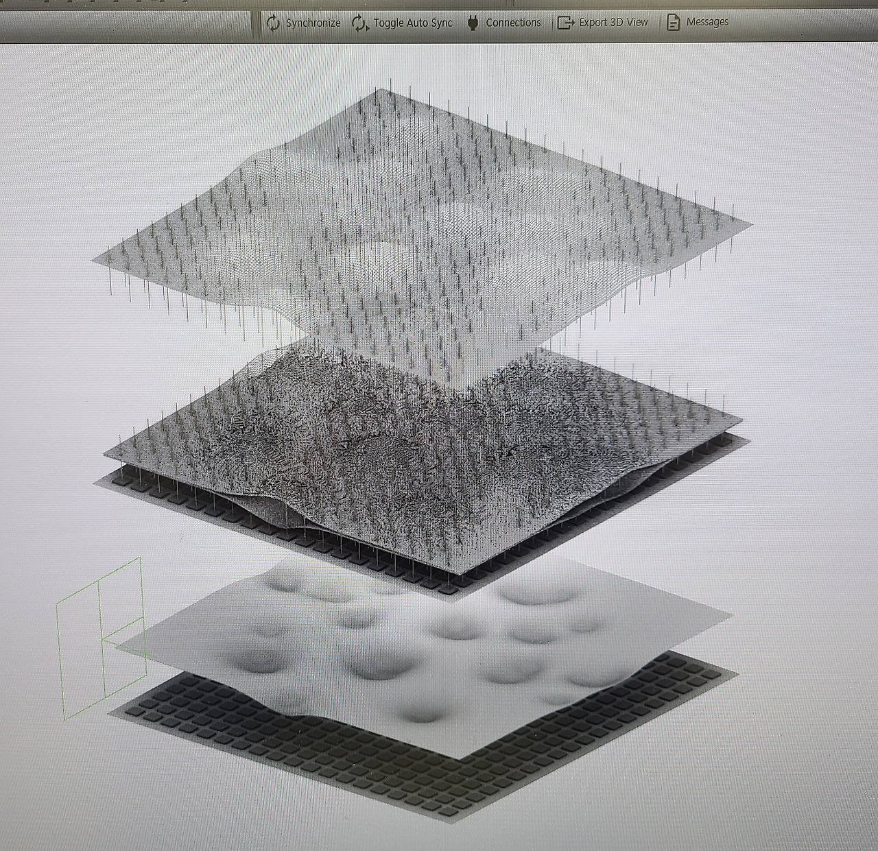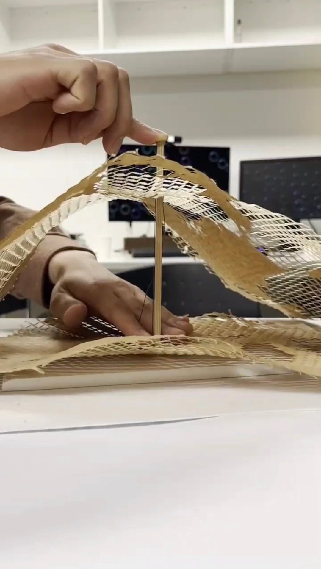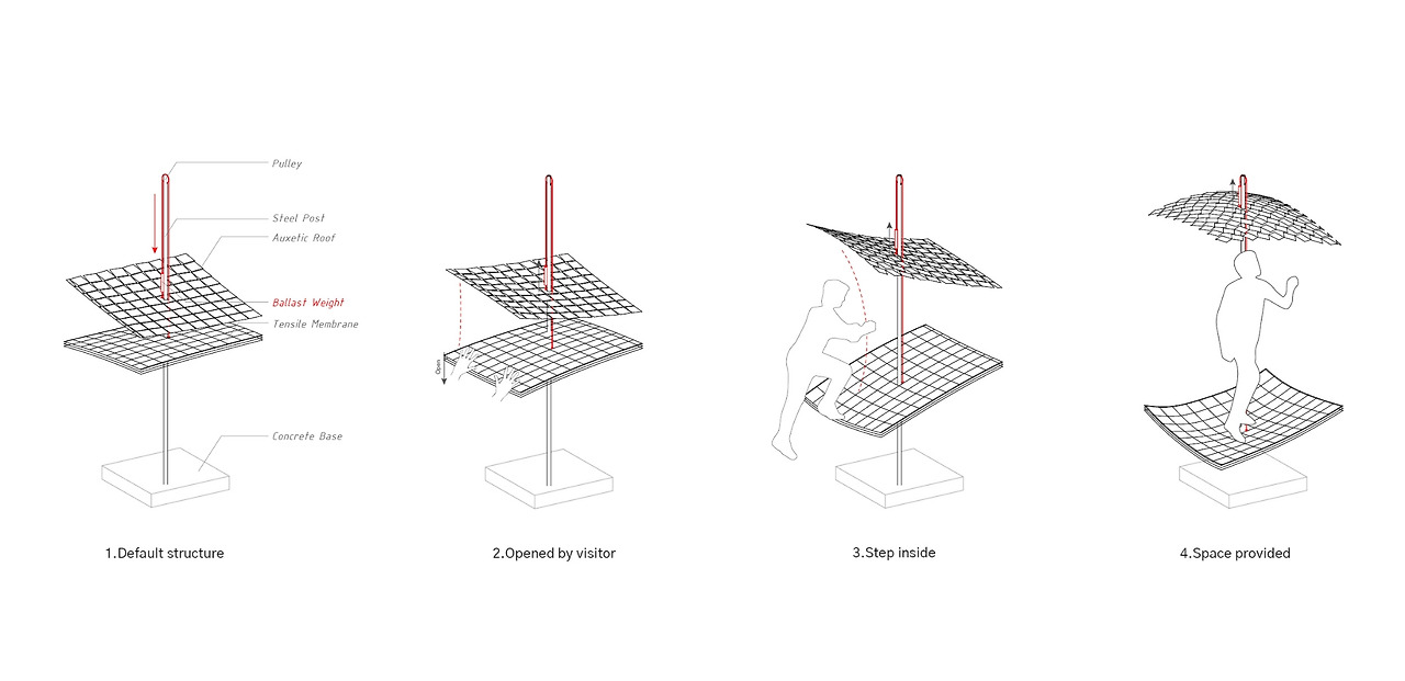 사람들이 위치한 곳에 공간이 생기는 만큼, 그곳에 자연광이 들도록 하는 것도 고민했다. 우리가 주목한 것은 auxetic 패턴들이었다.(이걸 한국말로는 대체 뭐라고 부르는지 모르겠다) auxetic구조는 약간의 탄성이 있는 재료들이라면, 종이 같은 막으로 만들었을 때 이것이 3d로 구부러지고 다시 펴질 수 있는 성질을 가진다. 섬유로 이루어지진 않더라도 직물과 같은 성질을 가질 수 있는 것이다. 이 패턴은 늘어날 때에 패턴 사이에 넓은 빈 공간들을 만들 수 있어서 유연하게 입체적으로 변화할 수 있다.