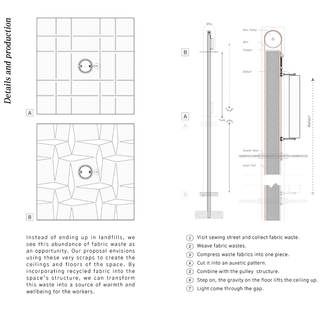 Instead of ending up in landfills, we see this abundance of fabric waste as an opportunity. Our proposal envisions using these very scraps to create the ceilings and floors of the space. By incorporating recycled fabric into the space's structure, we can transform this waste into a source of warmth and wellbeing for the workers.