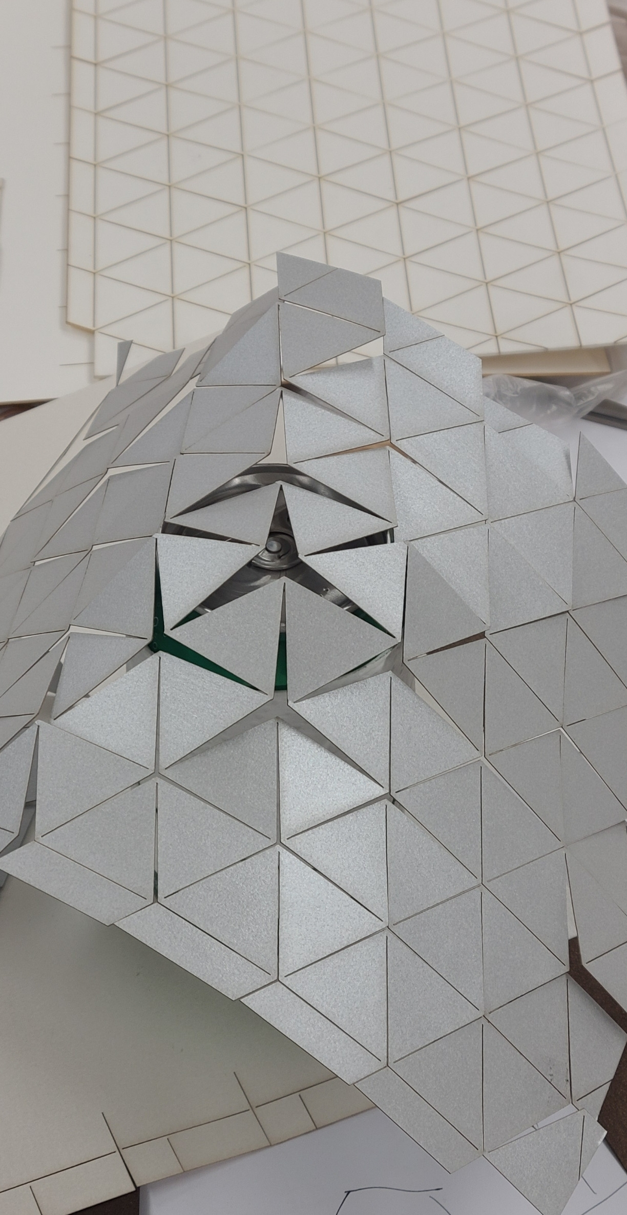 3d 모델링은 라이노를 이용해서 했고, 3d 곡면의 auxetic 패턴을 구현하는 것이 관건이었다. 다행히 패턴은 그래스호퍼로 비슷한 것을 만드는 예제가 있어서 가져와 적용해서 만들었다. 실제 모형에서와 같은 정확한 패턴으로는 어려웠지만, 단순한 방식으로 어느 정도 이 패턴을 표현할 수 있었다.
