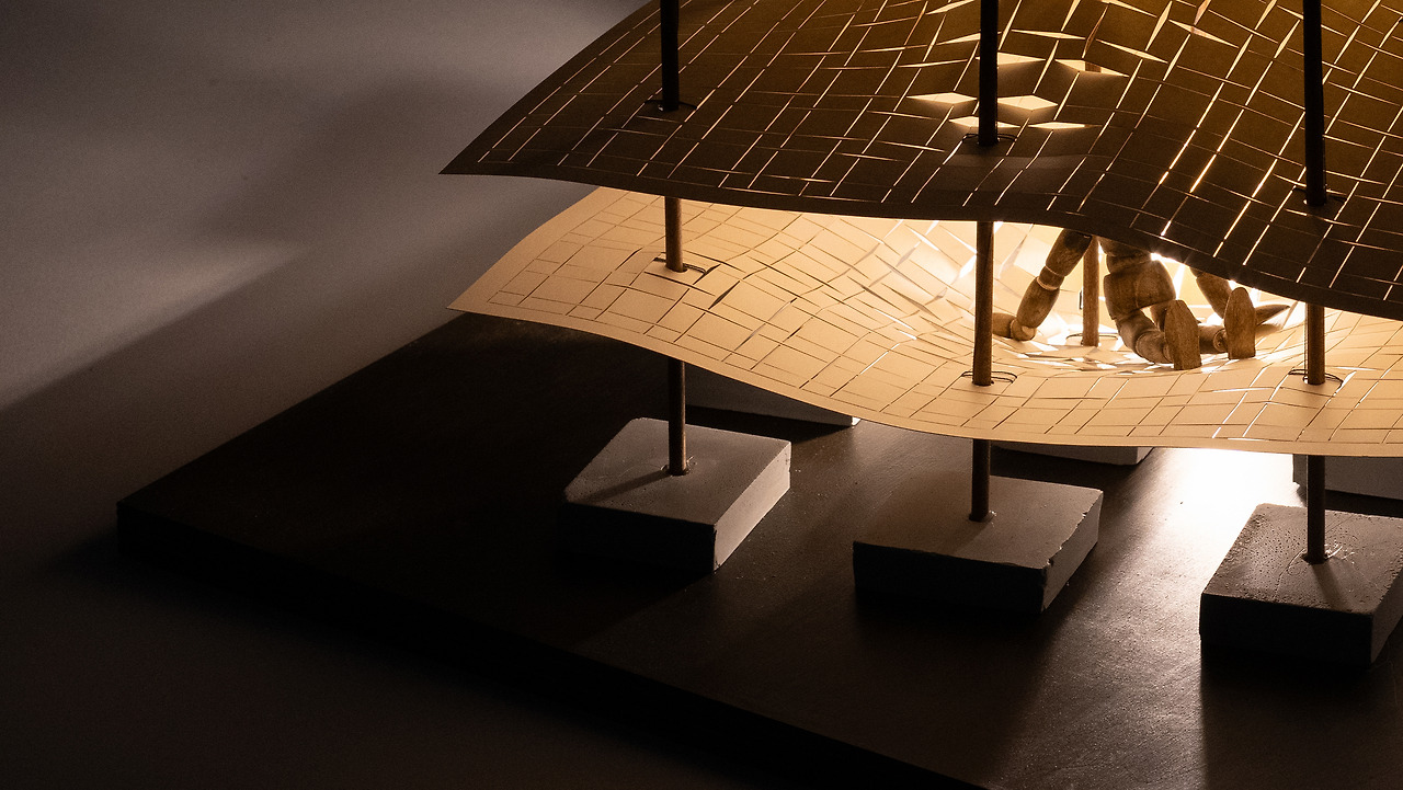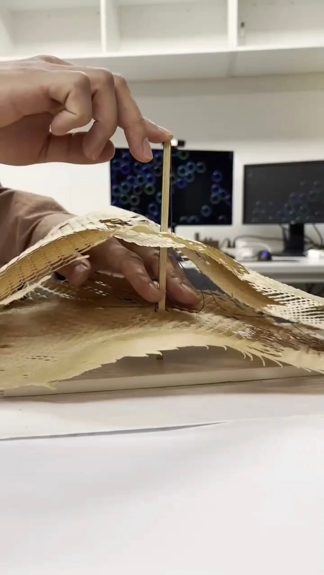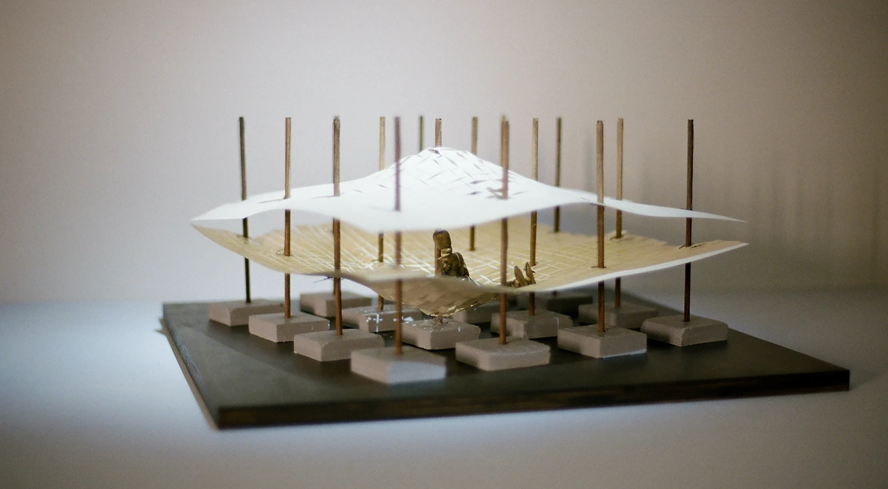 auxetic 패턴을 레이저 커팅한 종이를 나무봉에 끼우고 위와 아래의 종이를 실로 연결했다. 테스트모형은 1/10 사이즈로 파빌리온의 일부분으로 만들었다. 설계에서는 1.5m 간격으로 기둥을 설치하고, 이 기둥의 위쪽에 도르래를 설치해 와이어로 두 겹의 막이 연결되도록 했는데, 모형에서는 간단하게 나무 막대에 홈을 파고, 거기에 실을 걸어서 구현했다.