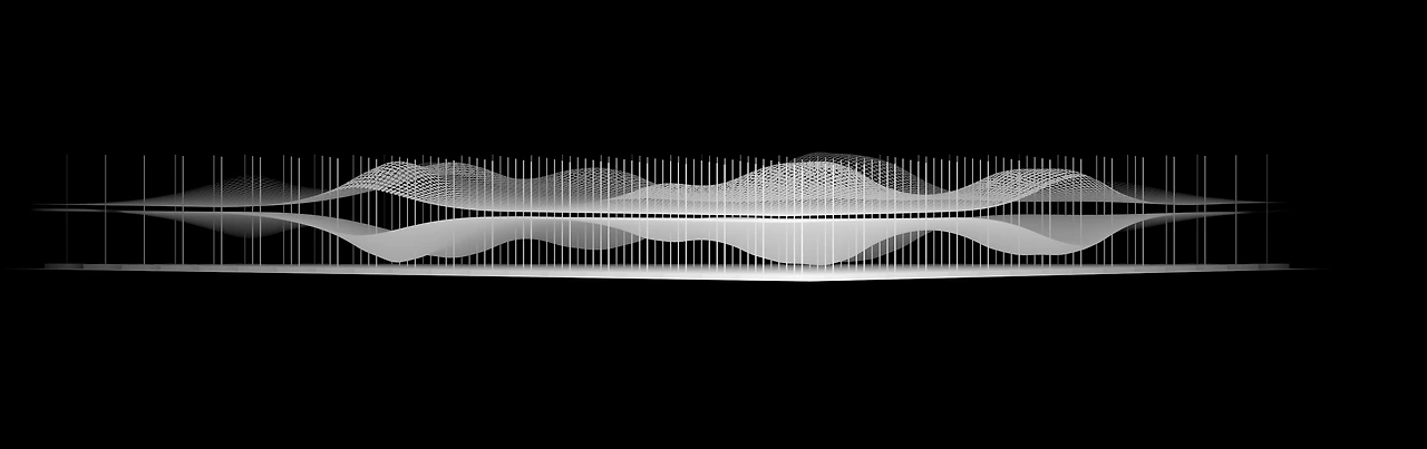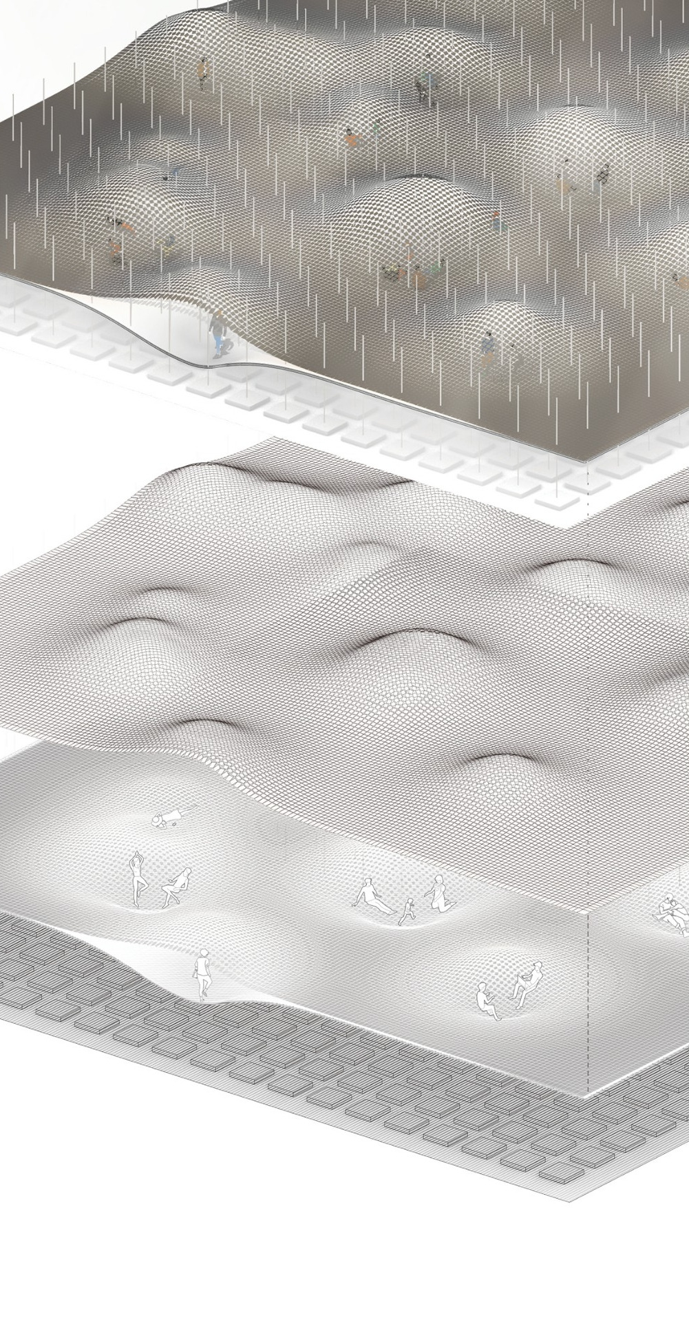 특정한 사이트는 정해지지 않은 상태로 광장과 같은 장소에 설치된다는 생각이었기 때문에 35 m×35m 정도의 큰 파빌리온으로 구상했다.