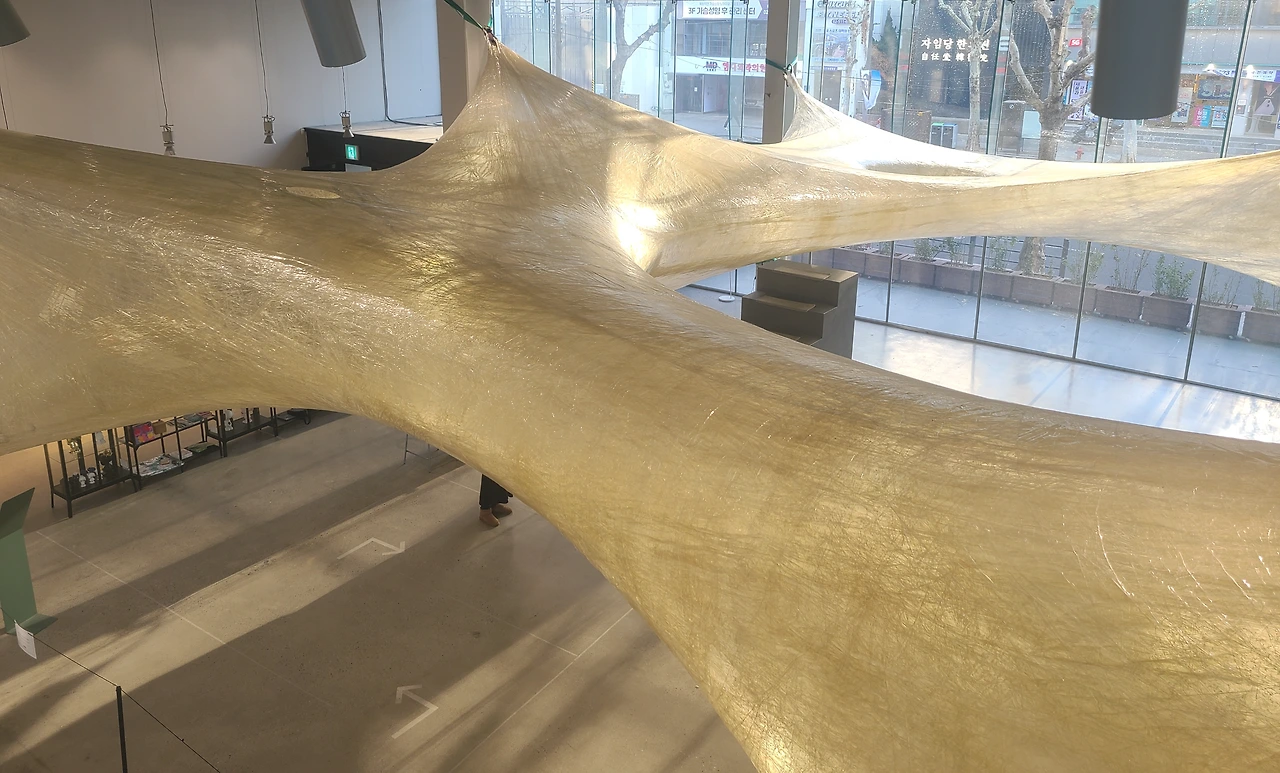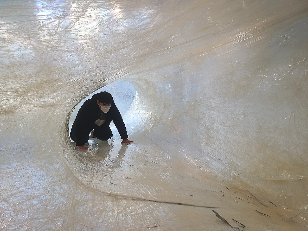 몇 년 전 전시를 다녀왔던 것이 생각난다. 테이프를 이용해 마치 공중에 매달린 누에고치 같은 구조물을 만들고, 사람들이 그 안을 기어 다니도록 하는 전시다. 그 안에 들어가면 누구나 기어 다니고, 뒹굴거리게 된다. 그 공간이 주는 이상한 편안함에 사람들은 아이처럼 해맑은 표정으로 이곳저곳을 탐험하게 된다.