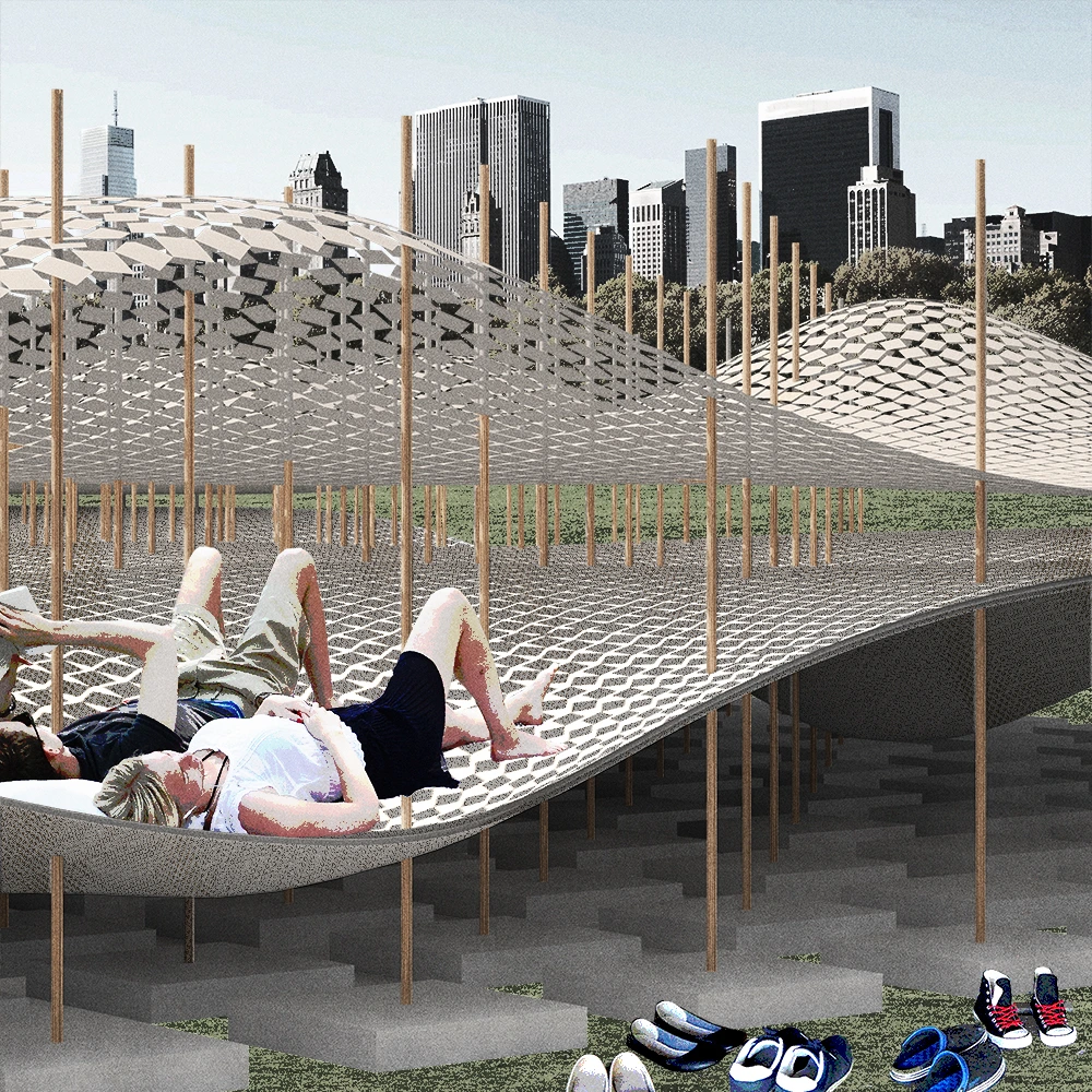 승현이의 아이디어를 듣고, 이를 구현할 수 있는 일종의 기계장치를 생각해 봤다. 테이프서울, 프라이 오토의 구조물 같은 막구조에 꽂혀있던 그때 나는 파빌리온에서 사람들이 유연한 막들 사이에서 뒹굴거릴 수 있는 무언가를 떠올렸다.