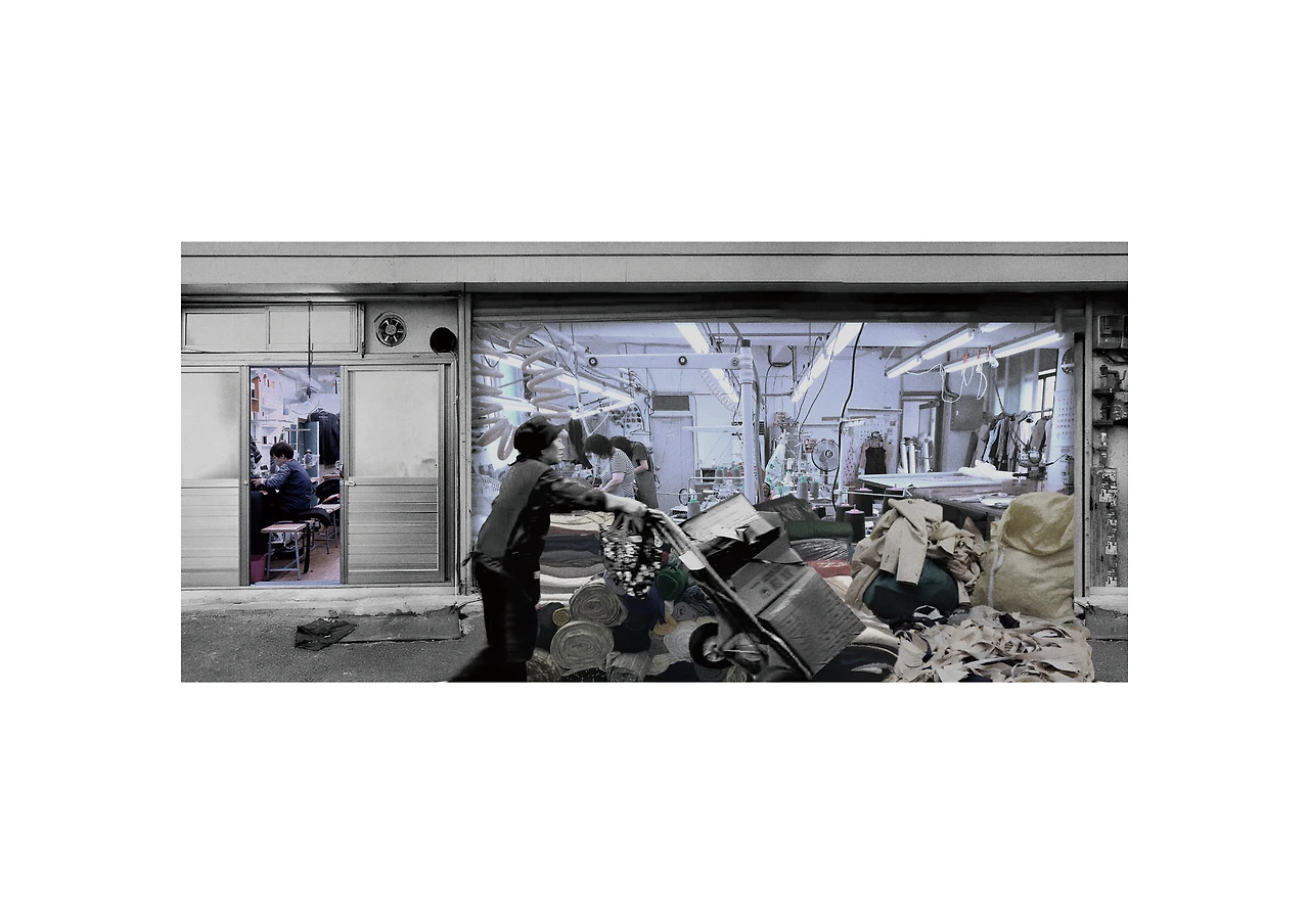 좁은 길들 옆으로 건물들이 늘어서서, 이 공장들은 햇빛이 잘 들지 않으며 바깥 풍경을 보기도 어렵다. 이런 환경 속에서 고령의 작업자들은 하루종일 재봉틀을 돌리며 옷을 만든다. 잠깐의 휴식시간에는 바깥으로 나와 기지개를 켜는 것이 이들이 취할 수 있는 전부다.