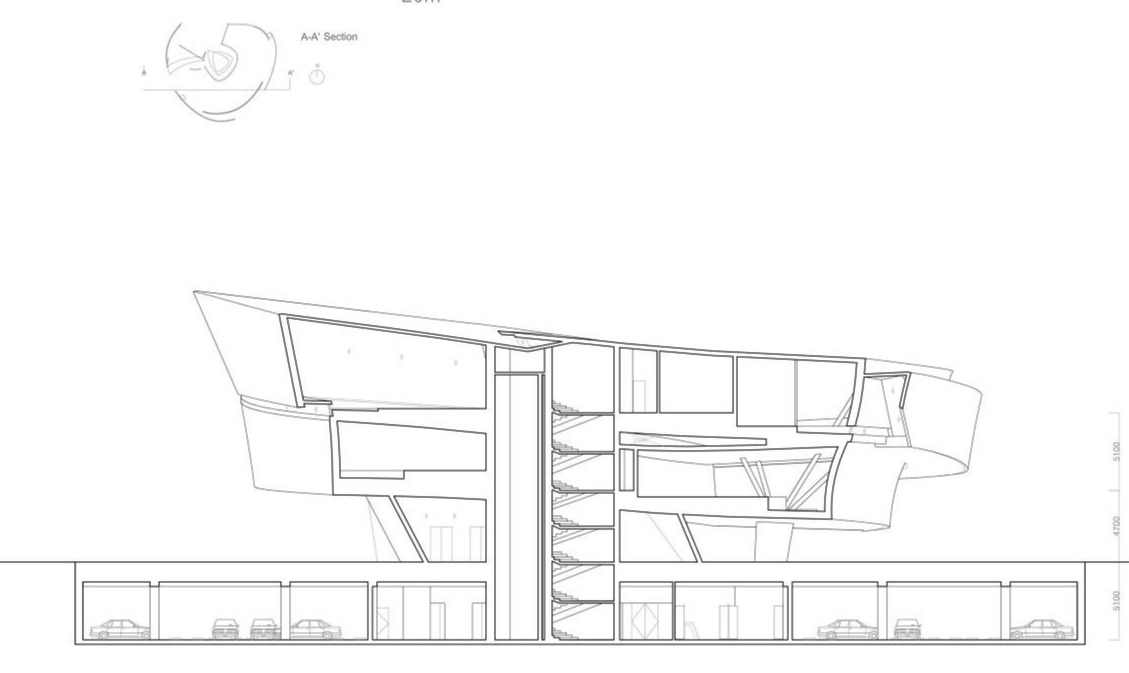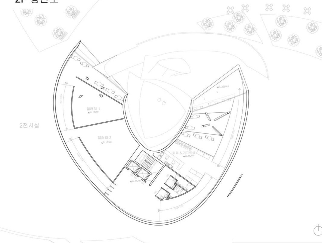 처음에 봤던 배치도로 다시 돌아가 보자. 이 건물은 기존의 아르코미술관보다 면적이 25% 이상 커졌다. 게다가 비정형적으로 생겨서 조감도를 대충 보면 마치 이 건물이 이 공원을 점부 차지하고 있는 것처럼 보인다. 스케치업으로 달팽이 모양을 만들 때부터 느꼈던 것이다. 건물이 제 기능을 하면서 비정형적인 멋을 가지려면, 어느 정도의 크기, 즉 면적이 필요한데 문제는 이 공원이 그리 넓지 않다는 것이다. 건물을 공중에 띄우기는 했지만, 그렇다고 마냥 키운다면 그 아래 공간들은 점점 어두컴컴해질 것이었다. 그래서 주차장이나 수장고, 작업공간, 창고 등의 공간들은 최대한 지하에 넣고, 지상에는 전시와 관련된 공간, 관람객들이 가는 공간들만 있도록 했다.