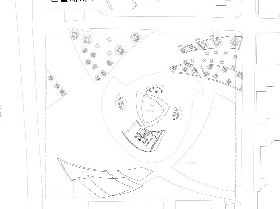 처음에는 이 공원에 나무를 많이 심고 숲처럼 만들고 싶었다. 공원인 줄 알고 갔더니 사람만 많고 너무 정신없었기 때문이다. 여의도공원 같은 공원을 생각하고 간 것이 문제였다. 이곳은 그런 공원보다는 광장에 가까웠다. 이곳과 이 주변은 홍대처럼 사람이 많고, 각종 행사와 길거리 공연이 이루어지는 공간이었다. 그래서 숲을 만드는 건 포기하고 어떻게 해야 이 역할에 맞는 공원이 될지 생각했다. 그래서 무대 공간과 잔디마당, 벤치와 테이블, 그리고 아무것도 없는 공간 등을 만들었다. 크고 작은 행사들이 이루어질 수 있는 공간들을 만드는 것이 중요하다고 생각했다.