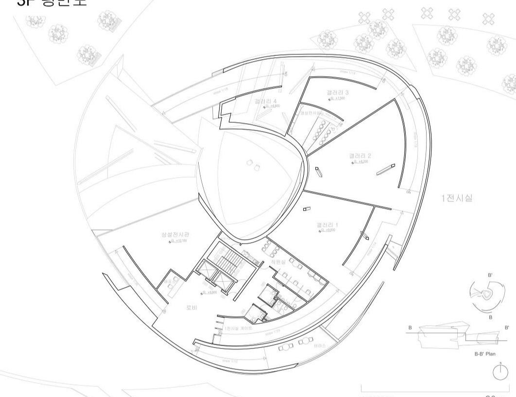 3층의 평면이다. 3층을 먼저 보여주는 이유는 미술관 관람객의 동선을 따라 3층부터 보는 게 자연스럽기 때문이다. 1층(지상층)에서 엘리베이터로 3층으로 올라가면 관람객은 슬로프를 따라 반시계 방향으로 내려가면서 전시실들을 들리게 된다. 그리고 이 슬로프도 전시공간의 일부로 쓰인다. 슬로프를 건물의 중심 쪽에 두었다면 각각의 개별 전시실을 크게 만들 수 있어서 좋았겠지만, 건물 규모가 작아 그렇게 할 경우 슬로프 경사가 너무 가파르게 된다는 문제가 생긴다.