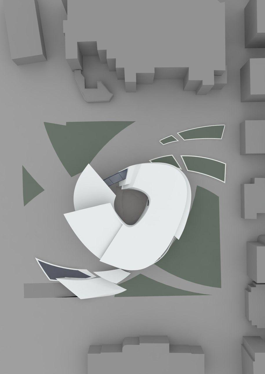 위에서 내려다본 배치도다. 사진의 오른쪽 아래는 주차장 캐노피와 작은 분수대가 있다. 초록색으로 표현된 부분들은 화단과 잔디공간이다. 이것까지도 '회전'이라는 건물 컨셉에 연결을 시켰다. 만들 때도 좀 유치해 보일까 봐 걱정했는데, 지금 보니 약간 유치해 보이긴 한다.