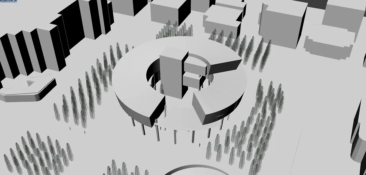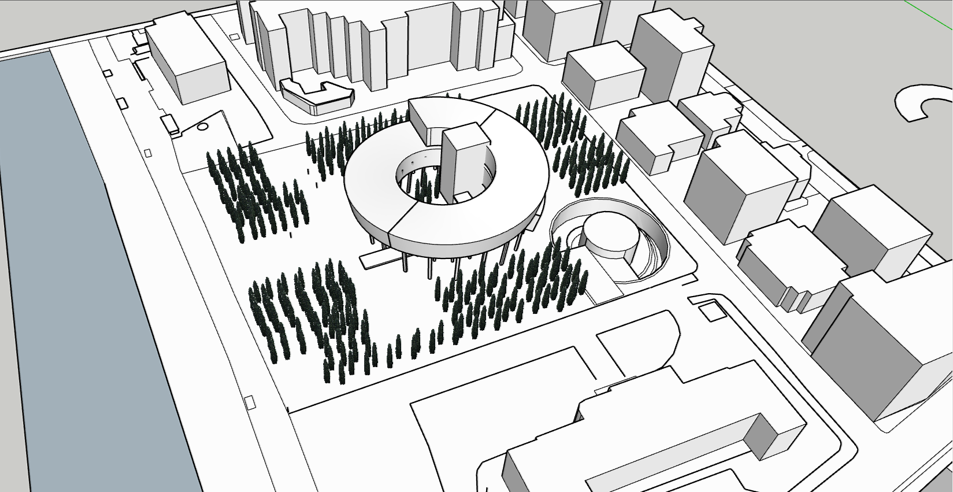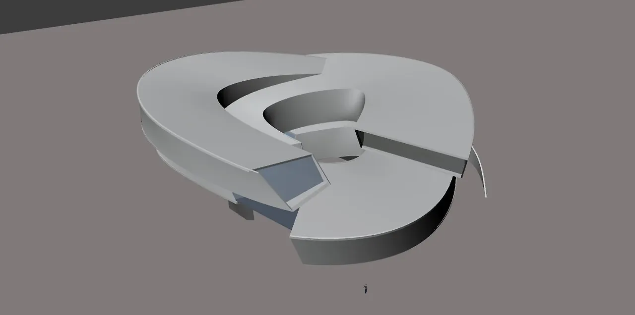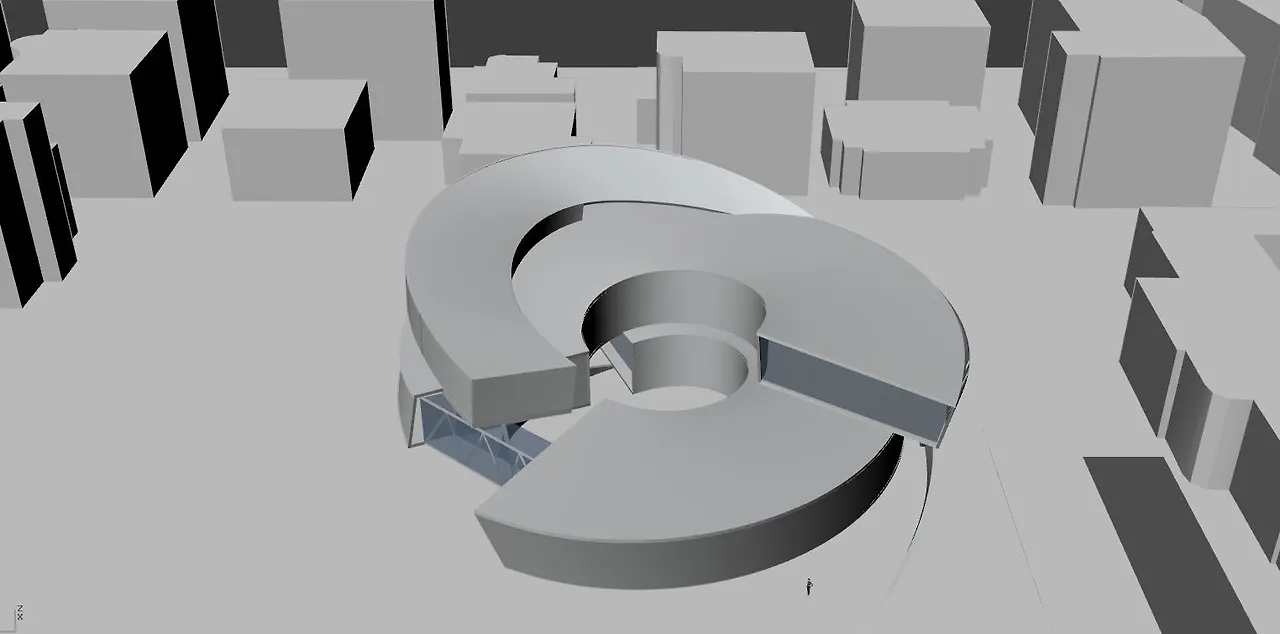 건물이 단순한 도넛 모양이 아니라 삼각형으로 하는 게 더 역동적이지 않겠냐고 교수님이 말씀하셨다. 이 얘기를 듣고 건물에 약간의 각도를 추가했는데, 이것도 상당히 효과가 좋았다.