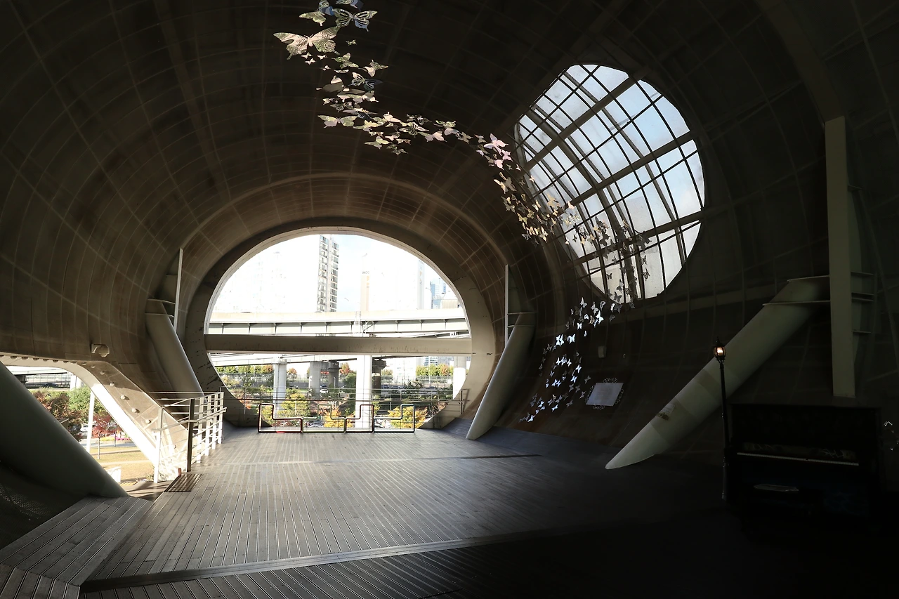위의 사진에서 보이는 유리 안쪽 부분은 카페 공간인데, 이왕이면 카페에서 무대 쪽으로 창을 만들어서 무대를 볼 수 있게 했으면 기능적으로 좋지 않을까 한다. 초기의 작고 많았던 기둥들은 3개의 큰 기둥으로 바꿨다. 그리고 이 기둥들 역시 건물과 함께 회전하고 있다.
