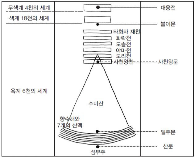 중문-답-금당으로 이어지는 정형적인 사찰의 형식이 산으로 가면서 무너지게 된다. 더 이상 평지가 아니기에 일직선의 축으로 공간을 형성하기가 어려워졌다. 본격적인 산사의 시대가 시작되면서 불교의 세계관을 공간적 형태로 표현하기 시작한다. 이때 만들어진 것이 일주문-사천왕문-불이문 구도이다. 불교의 세계는 지금 우리가 살고 있는 곳에서 수많은 바다와 산맥을 건너 수미산에 당도하고 산 정상에 오르면 무아無我의 세계에 이른다. 일주문은 수미산 초입을 상징하고, 사천왕문과 불이문을 지나 마침내 대웅전에 당도하는 것은 불교의 세계관에서 가장 높은 곳*에 이르렀음을 뜻한다.