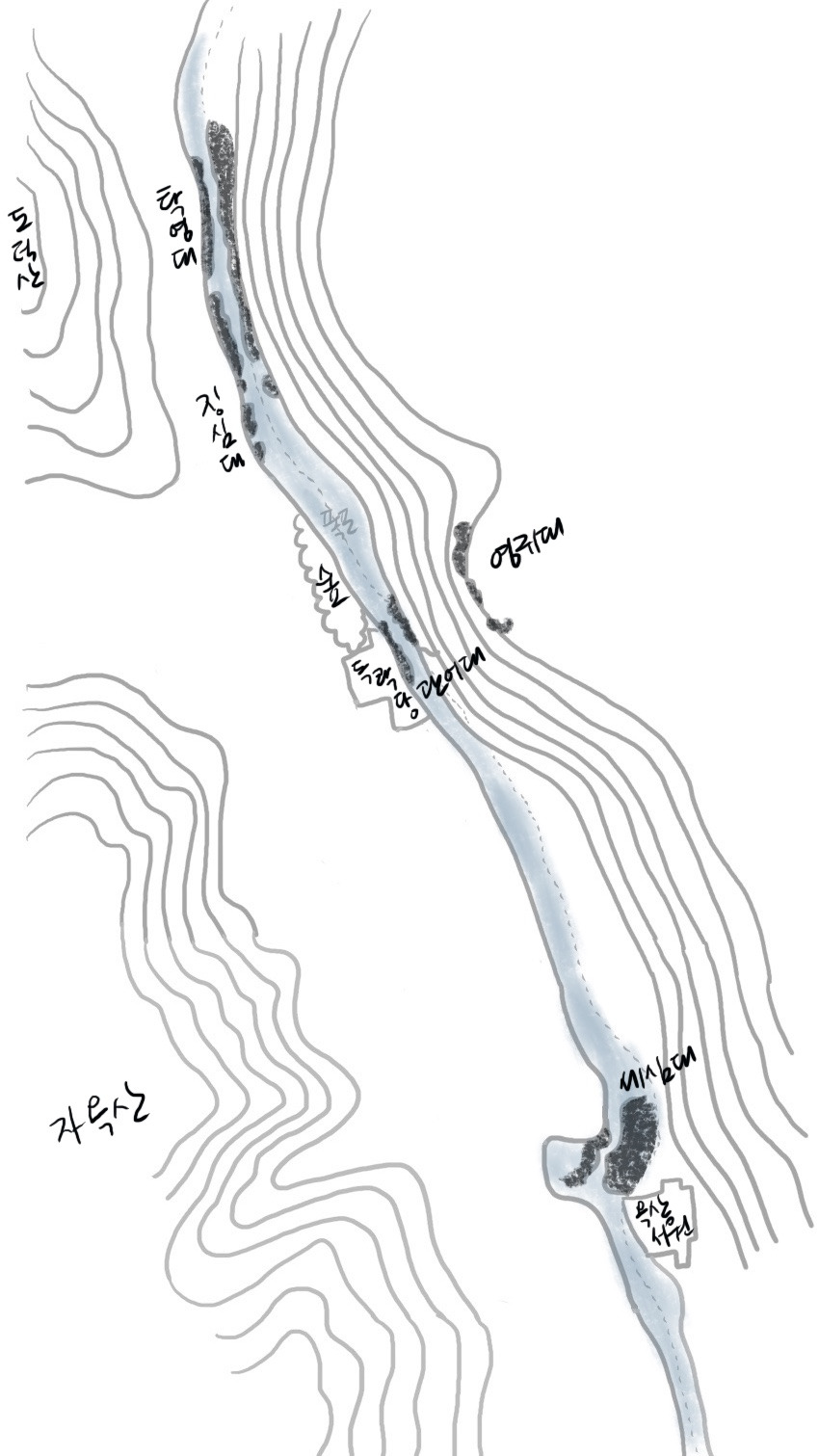 퇴계 이황의 스승이자, 조선 성리학 정립에 선구적인 역할을 한 회재晦齋 이언적은 홀로 즐기는 집이라는 뜻의 독락당에서 살았다. 이언적은 독락당 위 약 600m 부근에서 아래 700m까지 징심대, 탁영대, 관어대, 영귀대, 세심대라는 이름을 붙이고 이곳을 사유화했다. 주변 자연물에 이름을 붙이고 의미를 부여하는 것은 많은 선비들이 즐겨했던 일이다. 하지만 독락당을 중심으로 약 1.5km 정도 내외의 공간에 집중적으로 붙인 이름은 마치 이곳의 고요함을 지키기 위한 조치 같다.