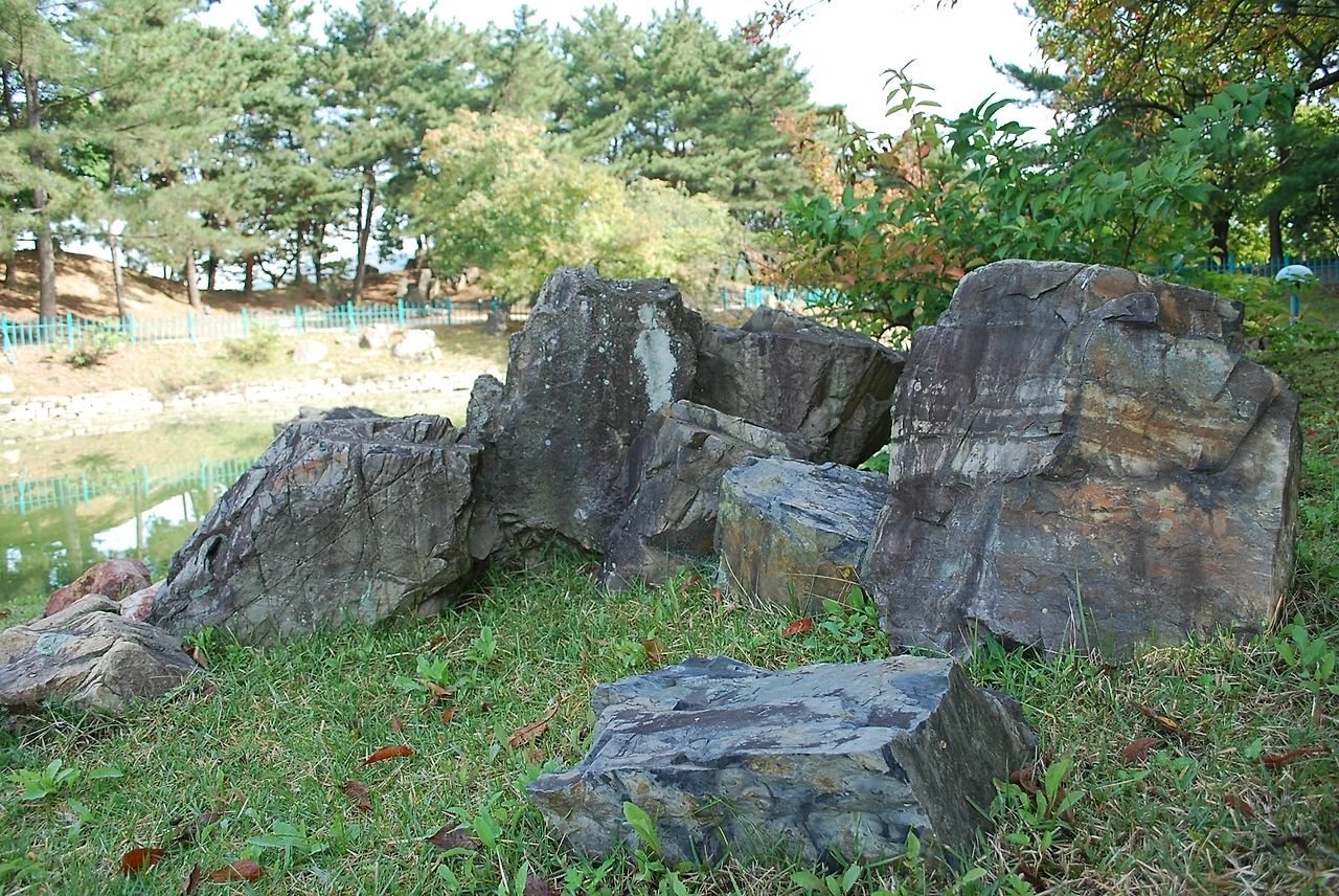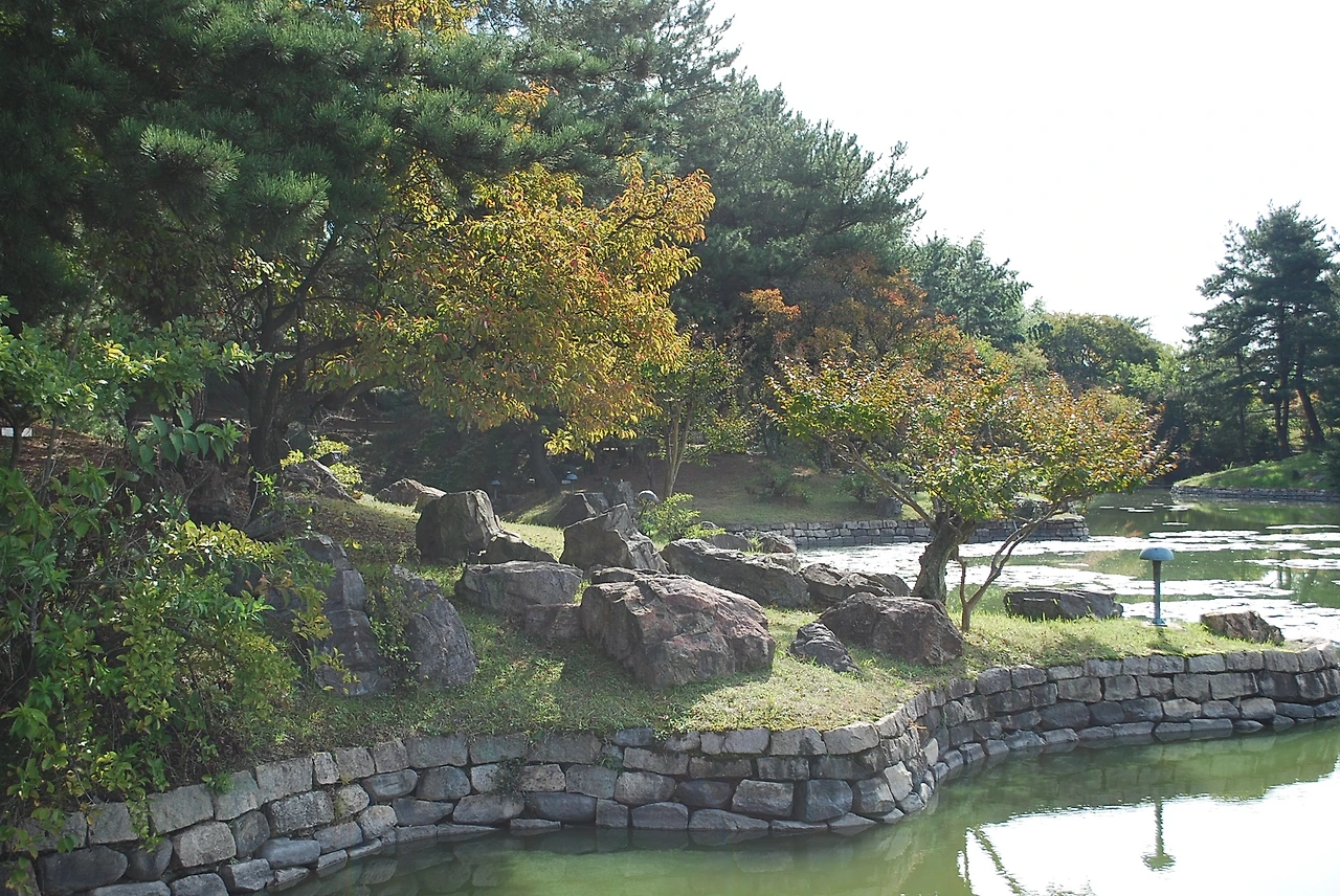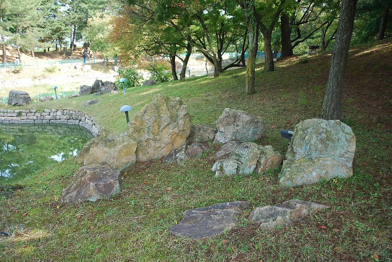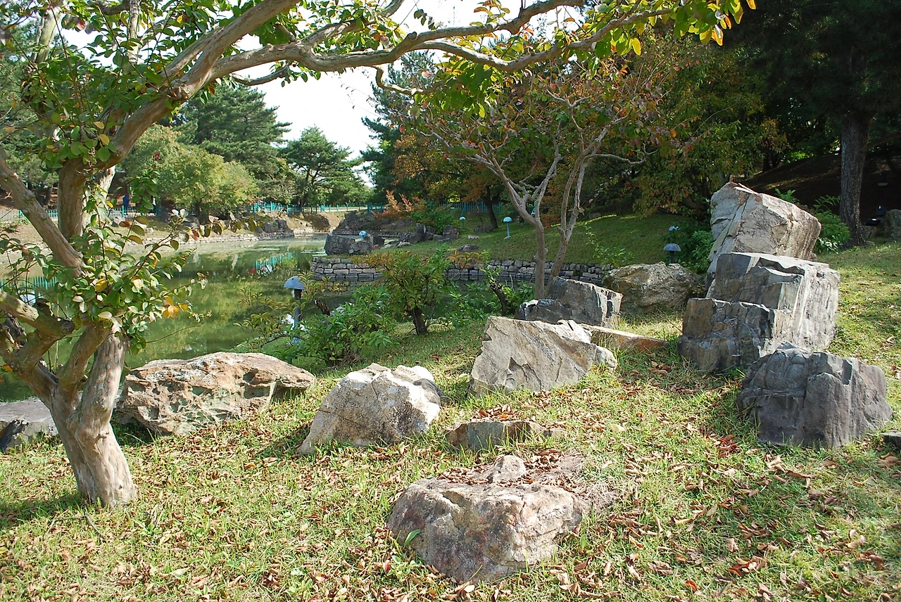 임해전에서 정원을 바라보았다. 전에 왔을 때는 눈에 들어오지 않던 돌들이 보였다. 동궁과 월지는 야경으로 유명하다. 저녁의 조명은 건축물과 나무를 향할 뿐 물가의 돌들은 어둠 속에서 보이지 않았다. 정원을 통과하는 길도 물가에서 한참 떨어져 있어서 연못의 가장자리를 장식하는 돌들을 볼 수 없었다. 이번에 월지를 온 것은 오직 돌을 보기 위해서였다. 천 개의 돌들을 가까이에서 관찰했다.